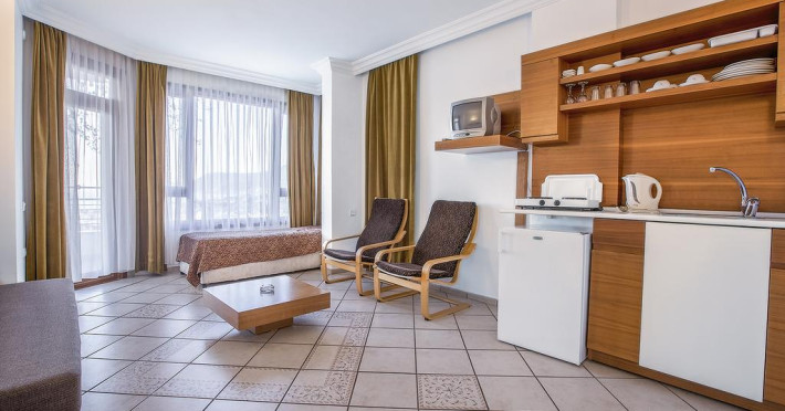 La Villa Sonata oaspeții au la dispoziție un restaurant care servește mâncare à la carte. Preparate din bucătăria internațională și turcească așteaptă să fie degustate în fiecare zi la micul dejun, prânz și cină. Masa poate fi servită atât în interior, cît si în aer liber, pe terasă, în funcție de vreme. Oaspeţii pot avea diverse băuturi răcoritoare sau alcoolice la bar. În cadrul proprietății există și un snack bar care servește băuturi și gustări. Oaspeţii îşi pot pregăti micul dejun şi alte mese şi le pot savura chiar pe balcon.