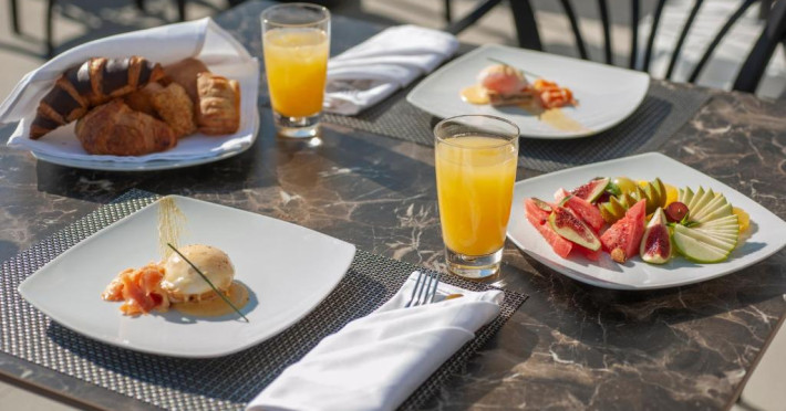 Vivid Blue, Serenity Resort pune la dispoziție in fiecare dimineață un mic dejun continental. Oaspeții pot comanda prin room-service sau pot savura sau băutură la bar.