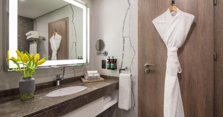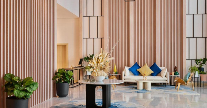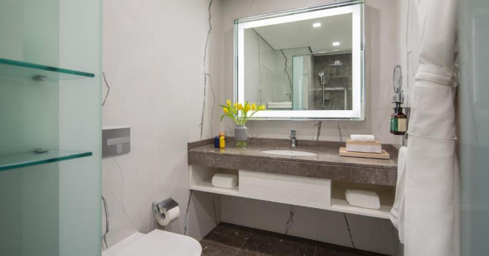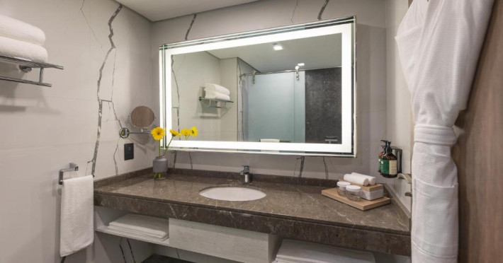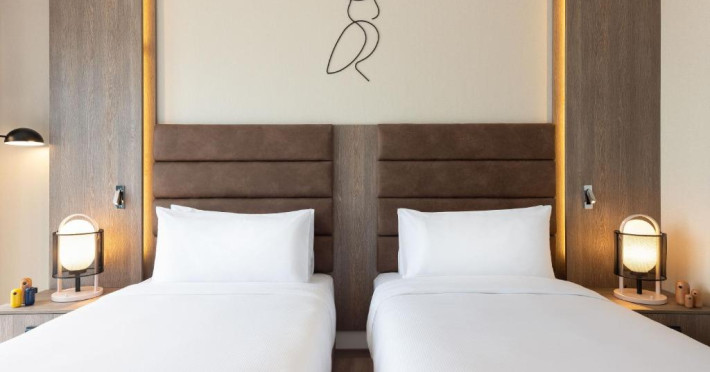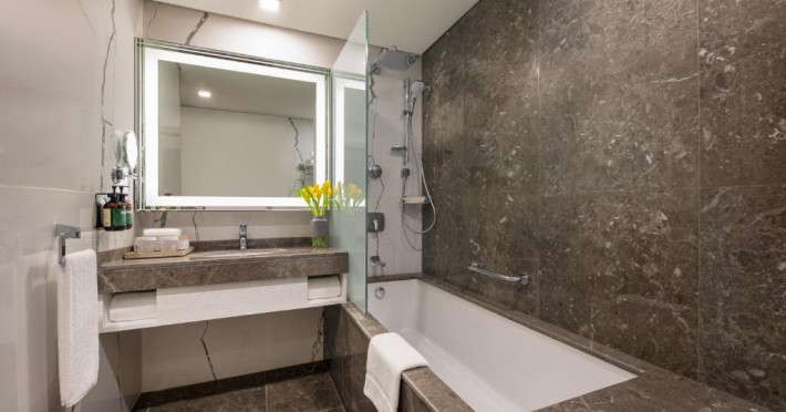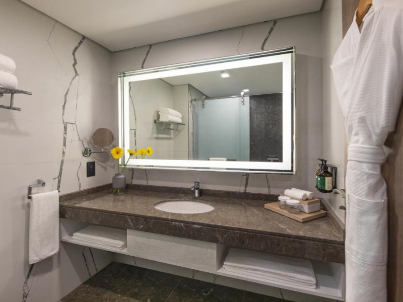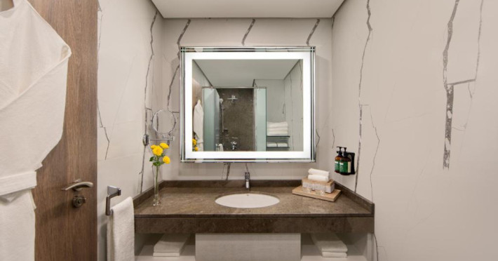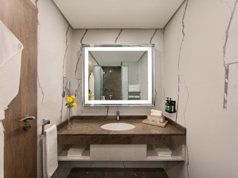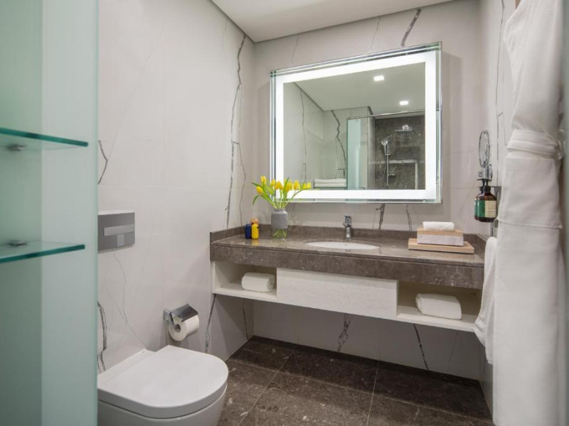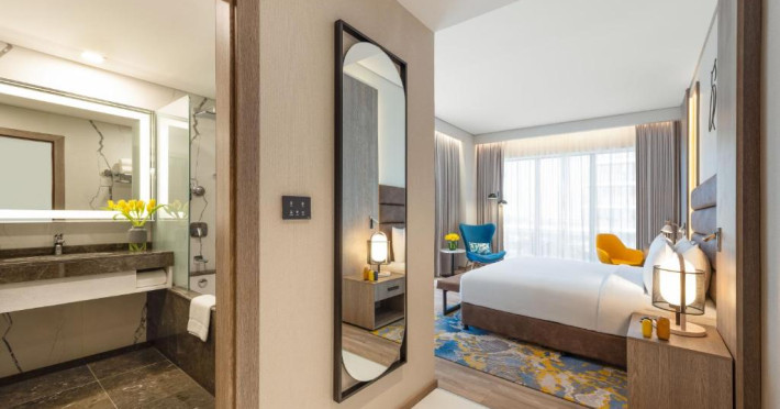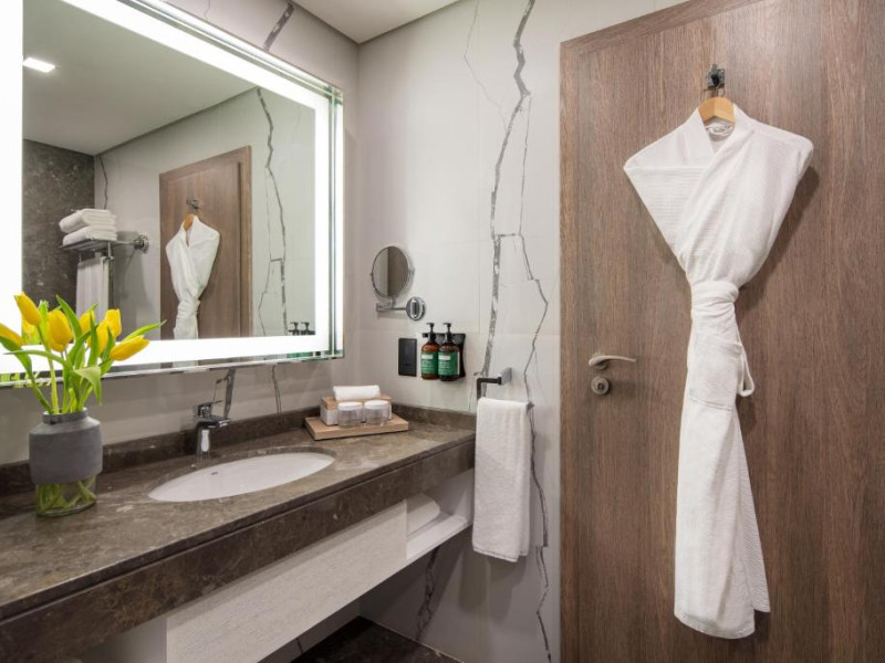Camerele și suitele spațioase sunt decorate in tonuri calde și dispun de balcoane private cu vedere spre mare sau spre oraș. Facilitățile includ 3 piscine infinity, inclusiv una pe acoperiș, spa de lux, centru fitness ultramodern și multiple opțiuni gastronomice, de la restaurantul mediteranean pană la lounge-ul panoramic.