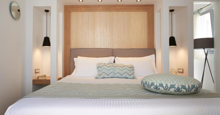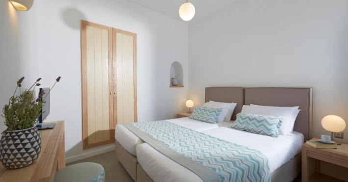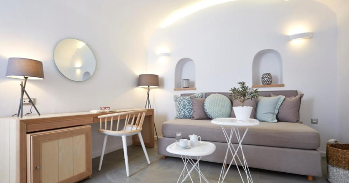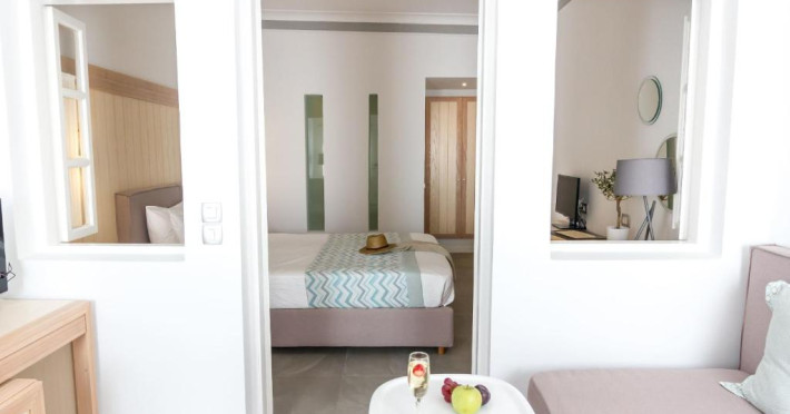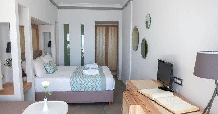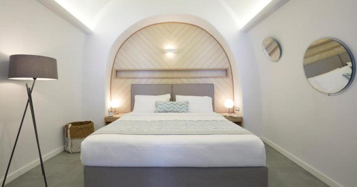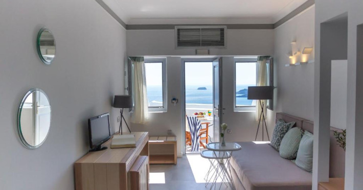 Sunt disponibile 100 camere. Camerele confortabile de la Volcano View sunt dotate cu pardoseală de gresie/ marmură, aer condiționat și Tv. În camere există baie cu cadă sau duș ce are în dotare foehn și articole de toaletă gratuite. Unele camere au balcon cu vedere la mare, unde oaspeții pot admira apusul sau răsăritul soarelui. Oaspeții au la dispoziție serviciul de room service pentru a servi masa sau diverse băuturi. Oaspeții au acces gratuit la serviciul Wi-fi în camere. Curățenia in cameră se face zilnic. Proprietatea oferă camere pentru familie cu o suprafață mai mare și un număr mai mare de paturi față de cele standard. Se pot rezerva de asemenea camere pentru nefumători.