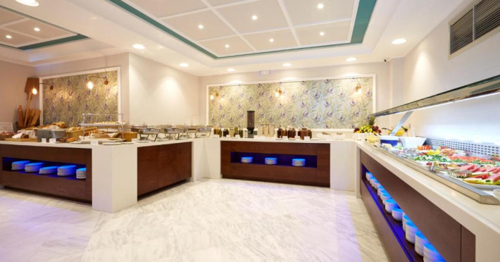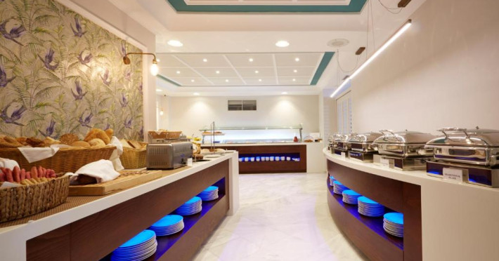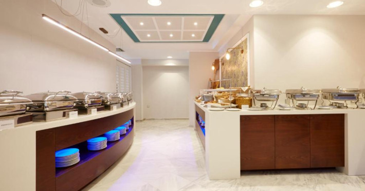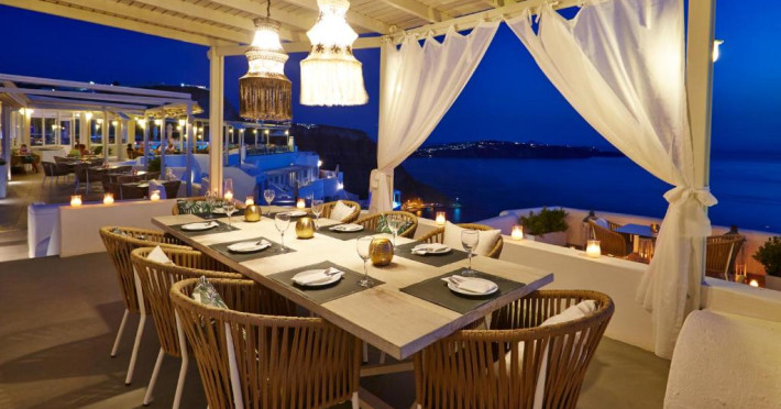 La Volcano View oaspeții au la dispoziție un restaurant care servește mâncare à la carte. Preparate din bucătăria grecească așteaptă să fie degustate în fiecare zi. Masa poate fi servită atât în interior, cît si în aer liber, pe terasă, în funcție de vreme. Volcano View servește zilnic un mic dejun tip bufet în zona de luat masa. Oaspeţii pot avea diverse băuturi răcoritoare sau alcoolice la bar. În cadrul proprietății există și o cafenea ideală pentru o gustare rapidă. Pentru cei cu anumite nevoi de nutriție, Volcano View oferă meniuri pentru diete speciale.