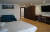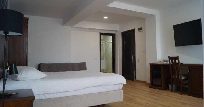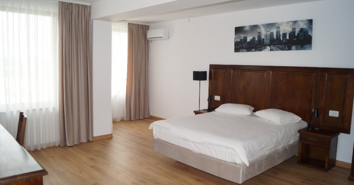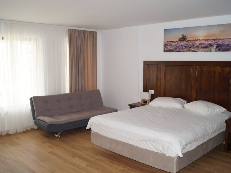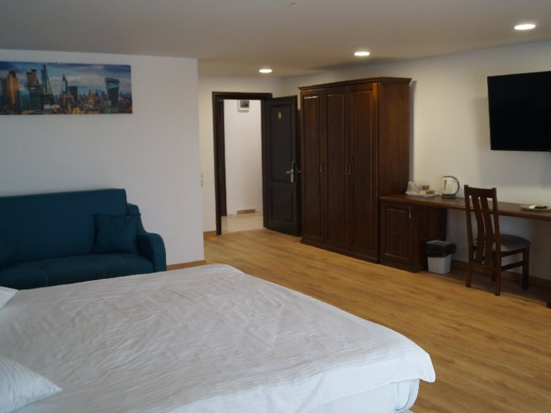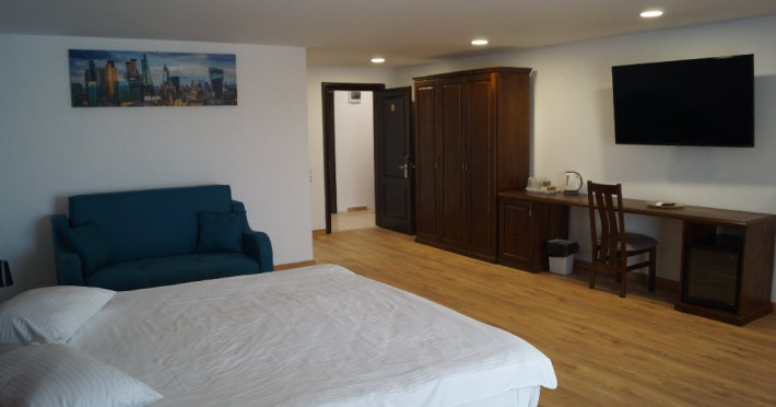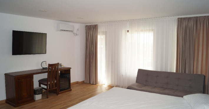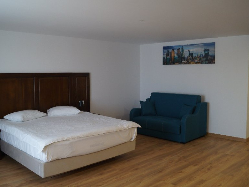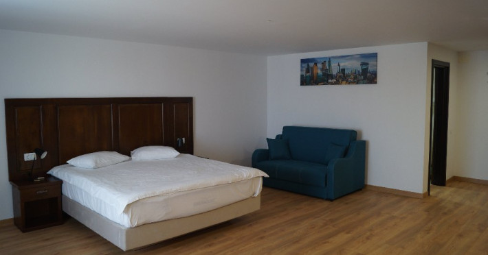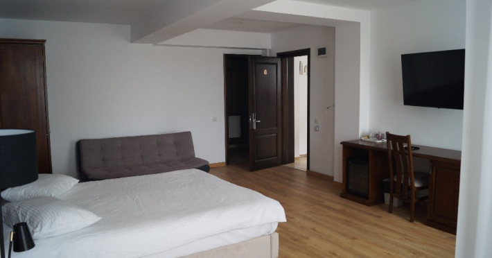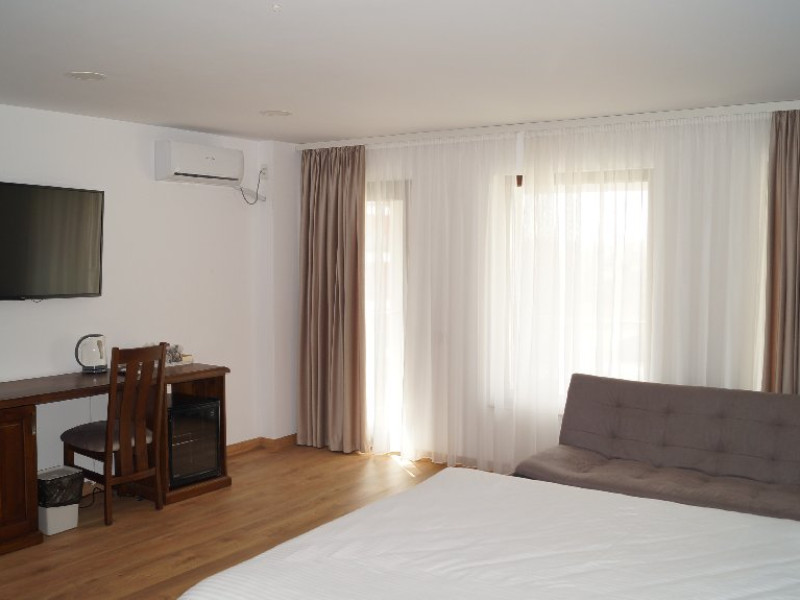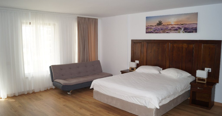 Camera dubla family (11) dispune de pat matrimonial (160x200) si o canapea extensibila (160x200 extinsa). Suprafata 44 mp (inclusiv balcon).