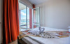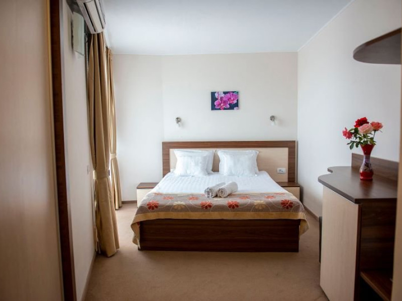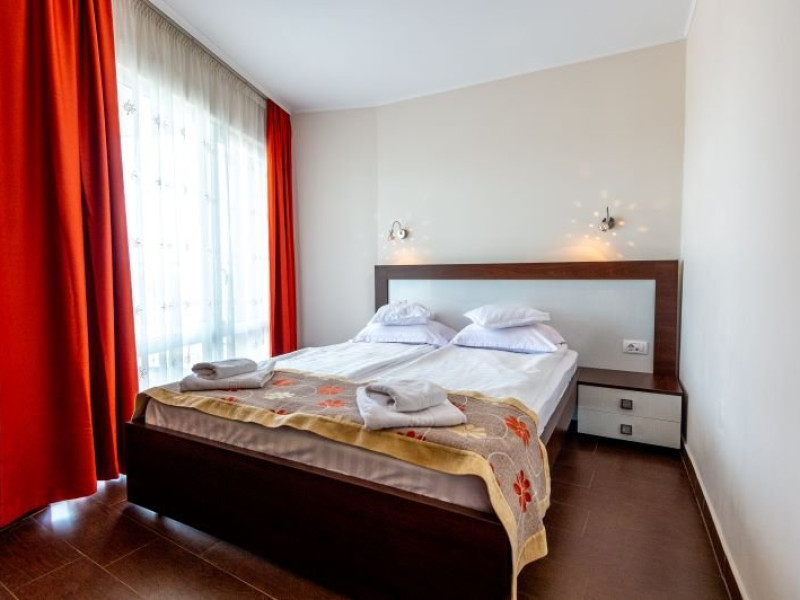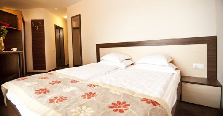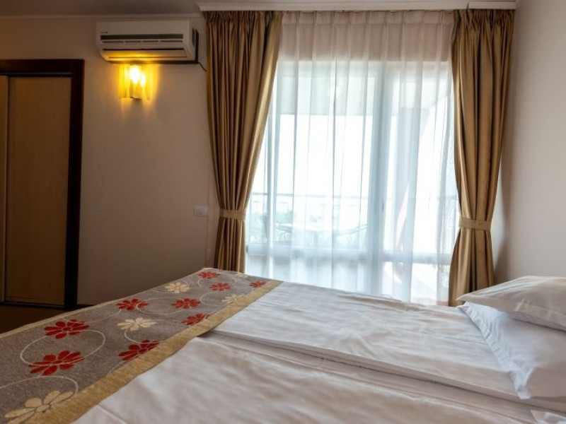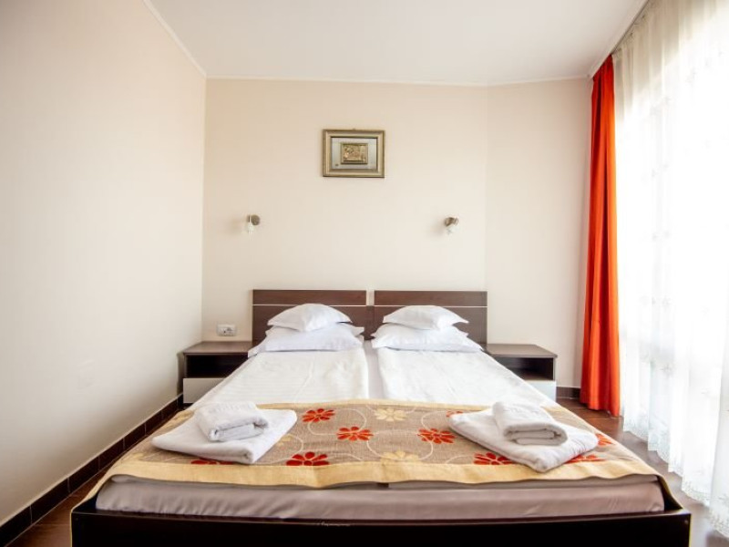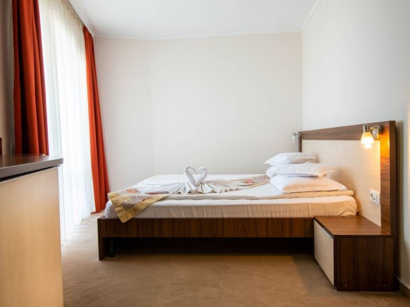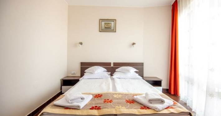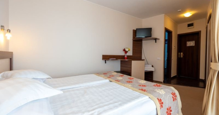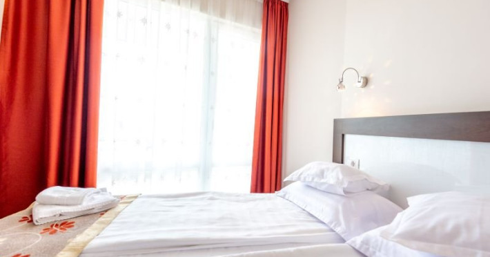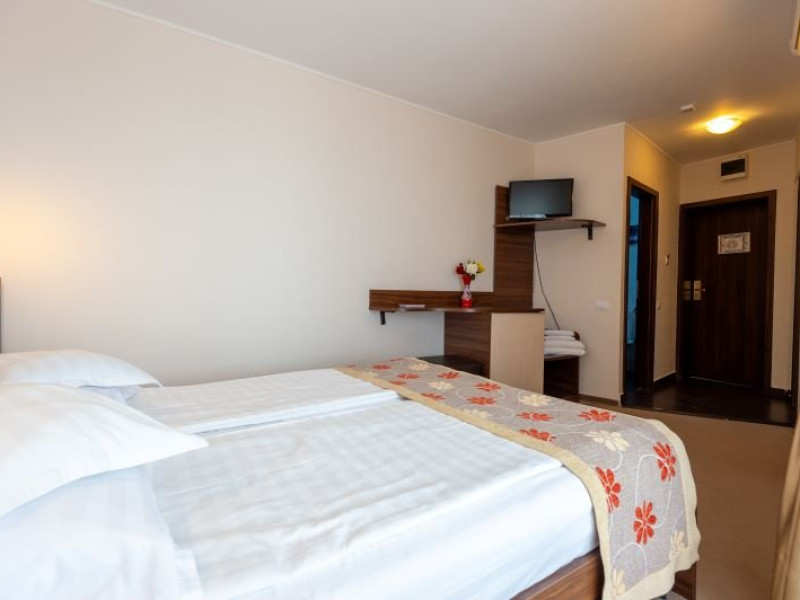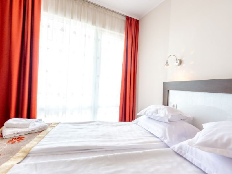 Va rugam sa aveti in vedere ca spatiul de manevra din camera poate fi astfel redus. Camera si balconul au suprafata aproximativa de 18 mp si sunt dotate cu pat dublu (160x200cm) sau 2 paturi twin (90x200cm fiecare).