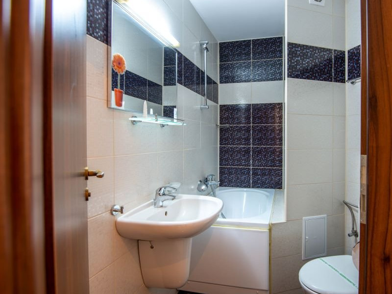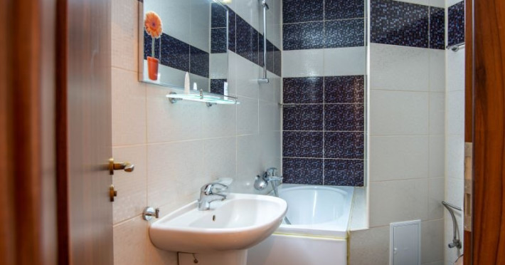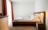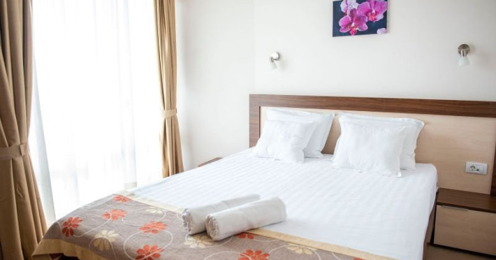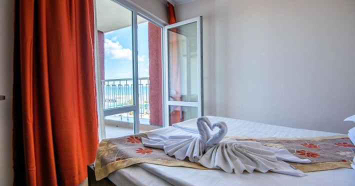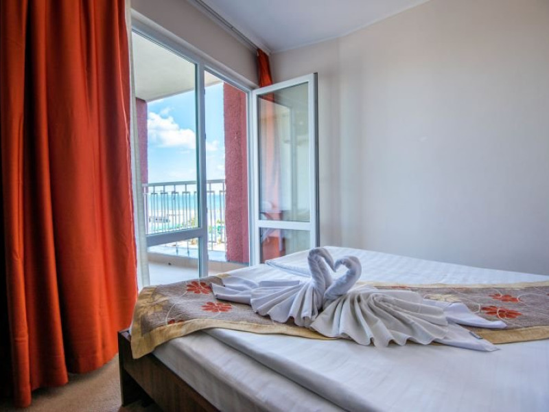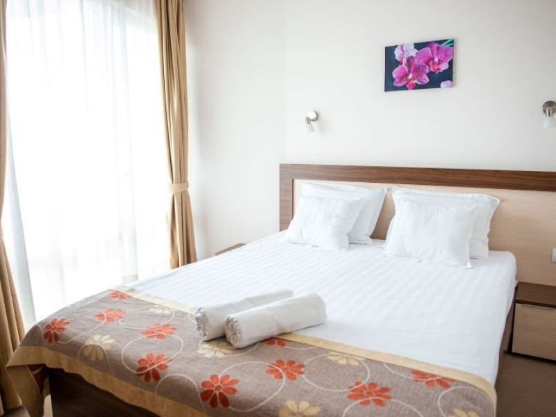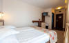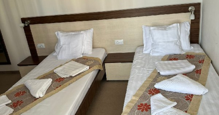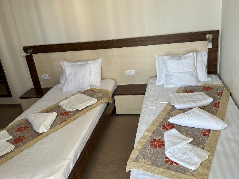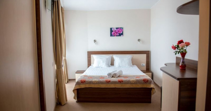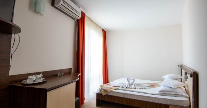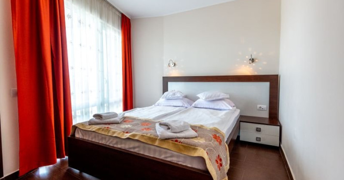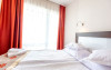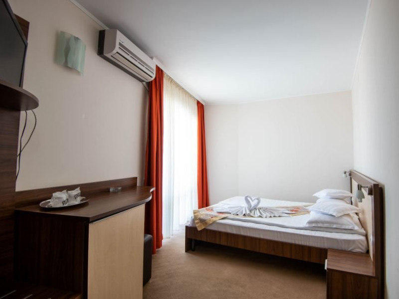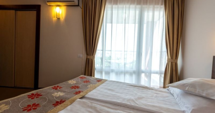 Va rugam sa aveti in vedere ca spatiul de manevra din camera poate fi astfel redus. Camera si balconul au suprafata aproximativa de 18 mp si sunt dotate cu pat dublu (160x200cm) sau 2 paturi twin (90x200cm fiecare).