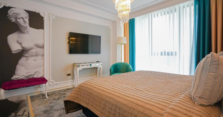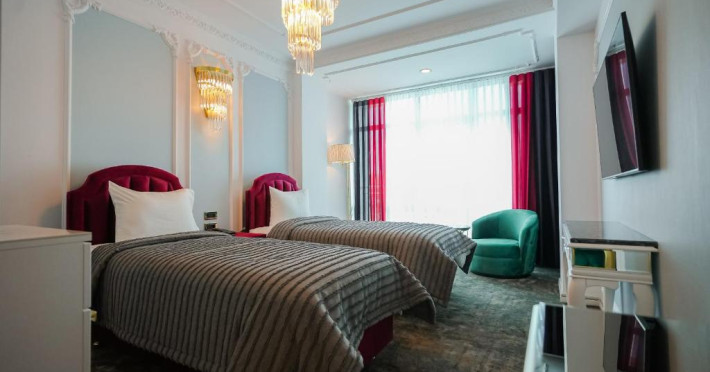 Hotelul nostru este alcătuit din 7 etaje, pe care sunt dispuse cele 63 de spații de cazare, restaurantul, terasa, sala de conferințe și centrul spa. Camerele noastre sunt spațioase și primitoare, au un design modern și cochet pentru cele mai fine gusturi in materie de confort și eleganță. Camerele noastre sunt dotate cu toate facilitățile unui veritabil hotel de 4 stele: pat matrimonial sau twin foarte comfortabile, fotoliu, birou, telefon, internet wi-fi, dressing, minibar, seif, cafetieră, televizoare LED Ultra HD, sistem de climatizare modern funcțional atat pe timp de vară, cat și pe timp de iarnă, izolare fonică, acces pe bază de cartelă magnetică, baie dotată cu cabină de duș, oglindă de make-up, uscător de păr și produse cosmetice din gama Rituals.