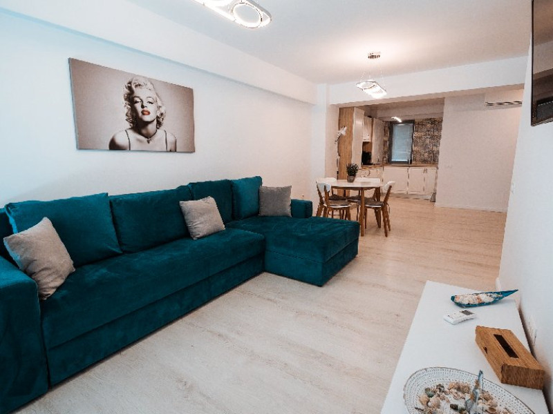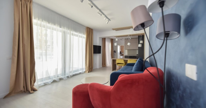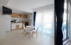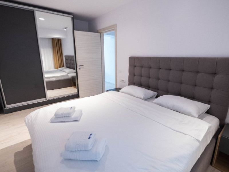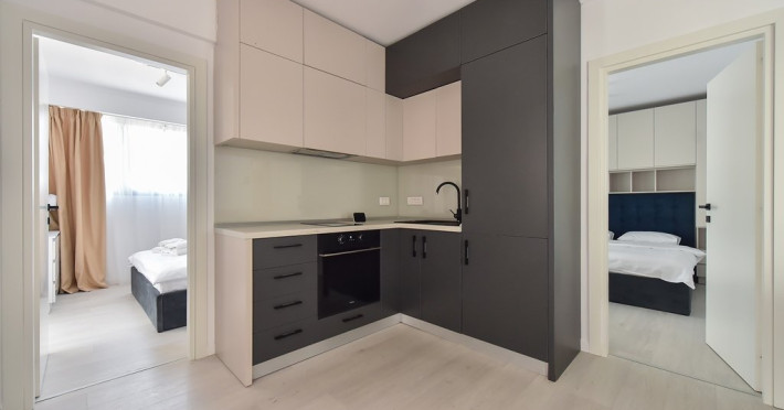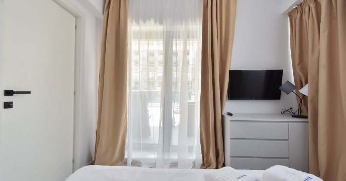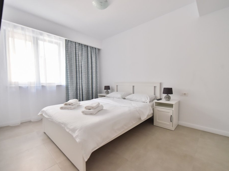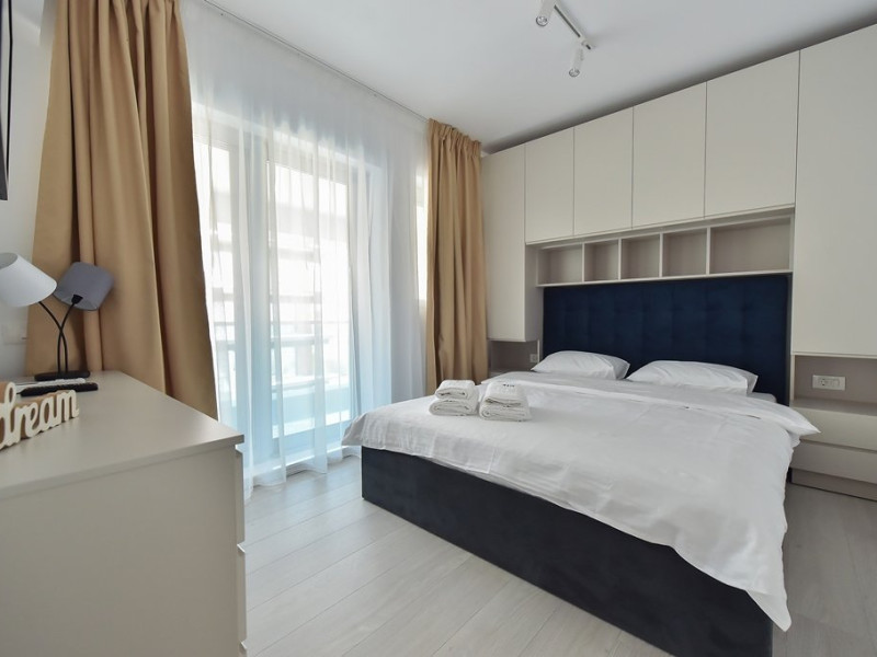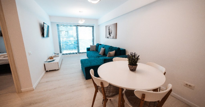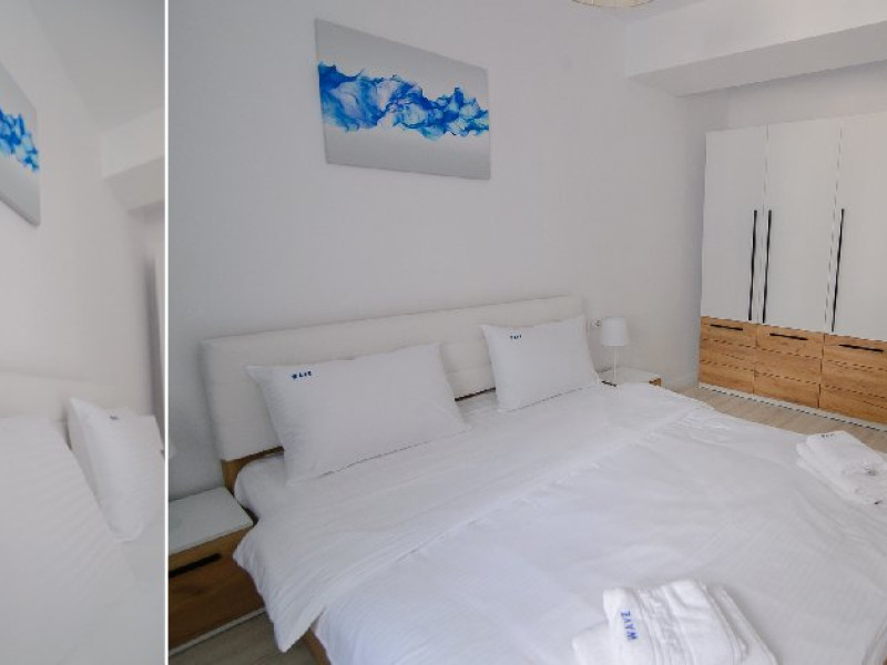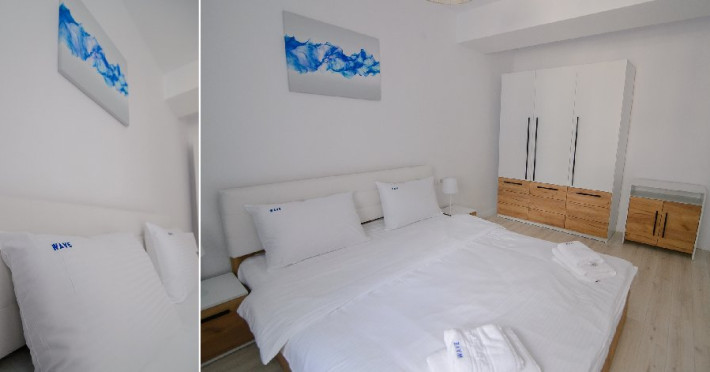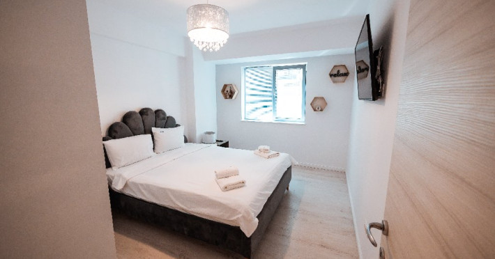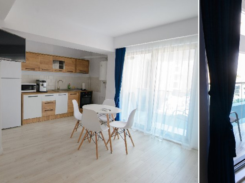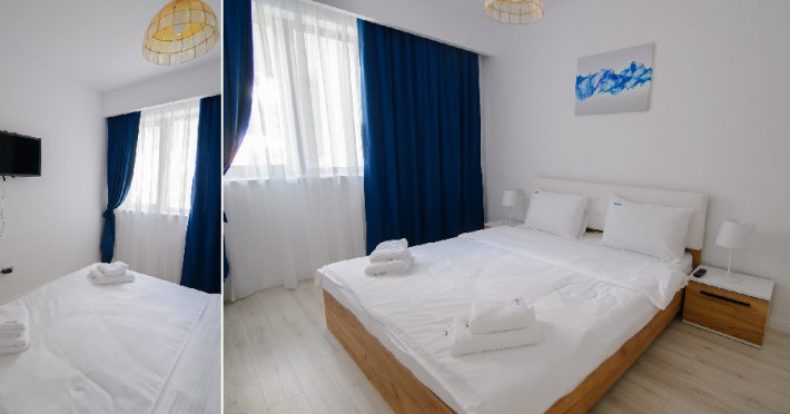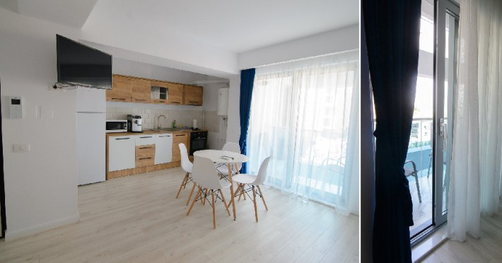 Dotari camere: bucatarie de tip open space, complet mobilata si utilata (frigider, plita pe gaz sau cu inductie, cuptor cu microunde, espressor de cafea cu cafea boabe, vesela, tacamuri), aer conditionat, TV LED cu conexiune cablu TV, acces Internet Wi-Fi gratuit, suport uscator de rufe, masa de calcat si fier de calcat, uscator de par, mobilier pe balcoane/ terase.