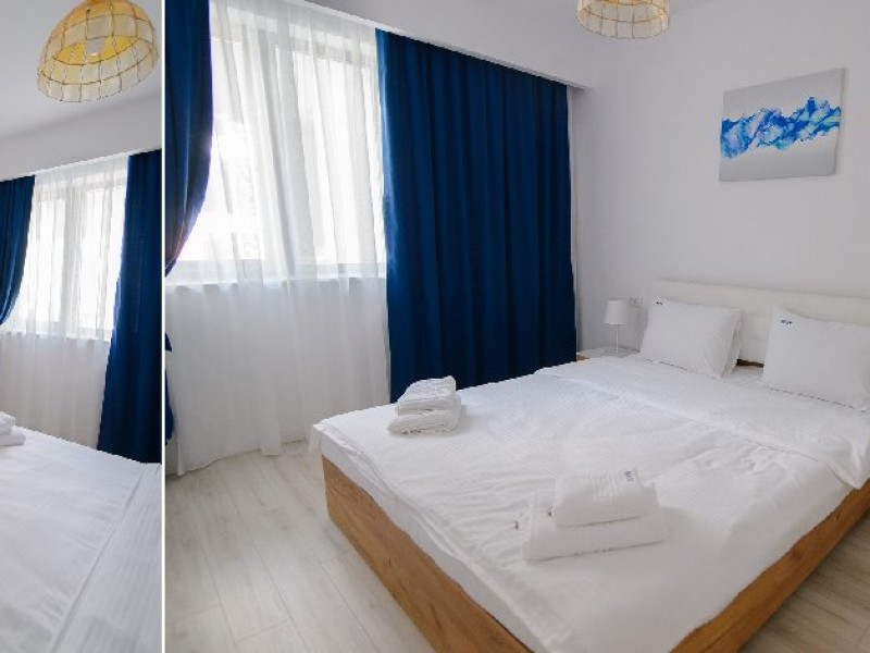 Apartamentul are 3 camere: 2 dormitoare cu pat matrimonial si living cu canapea extensibila.