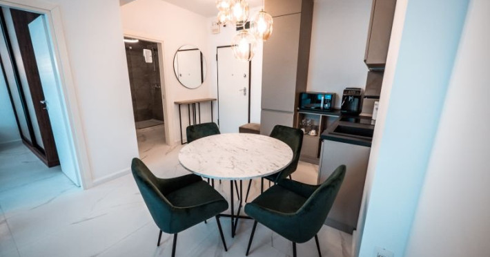 Toate unitatile de cazare dispun de: bucatarie de tip open space, complet mobilata si utilata (frigider, plita cu inductie, cuptor cu microunde, espressor de cafea cu cafea boabe/ capsule cu realimentare gratuita pe toata perioada sejurului, vesela, tacamuri).