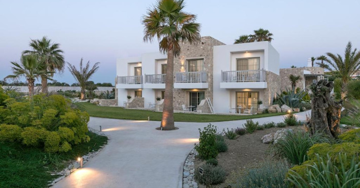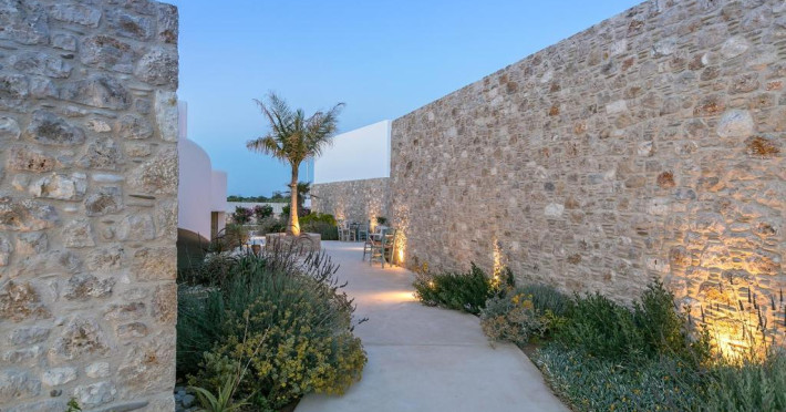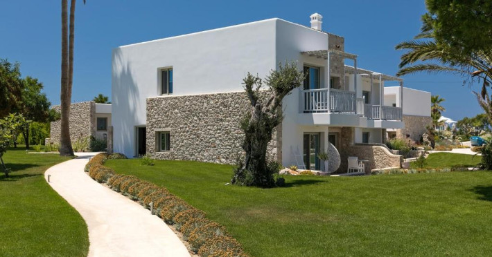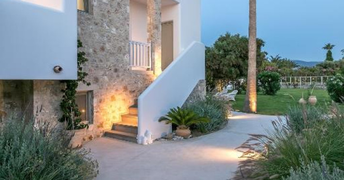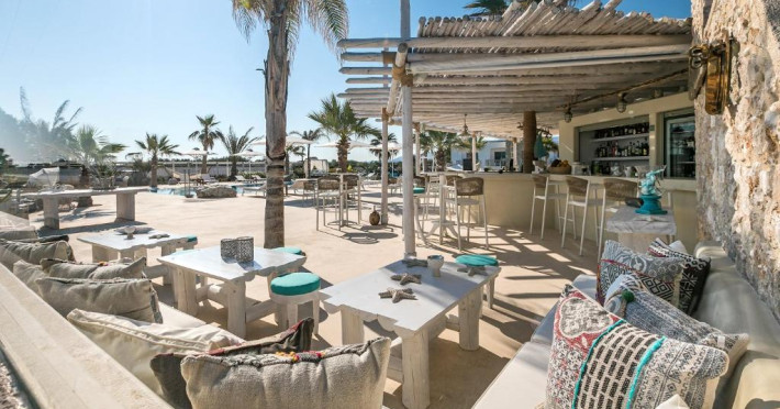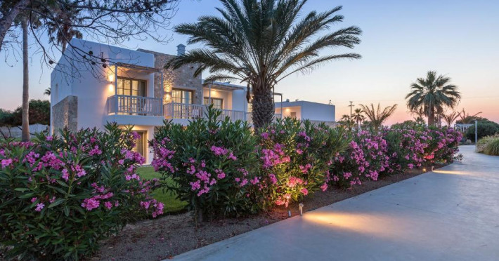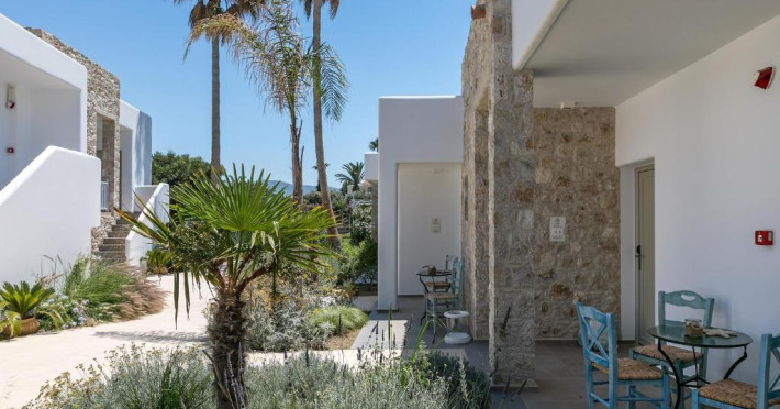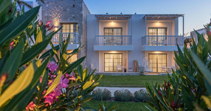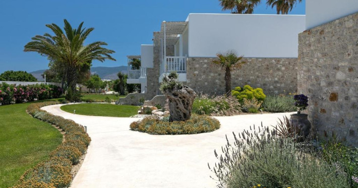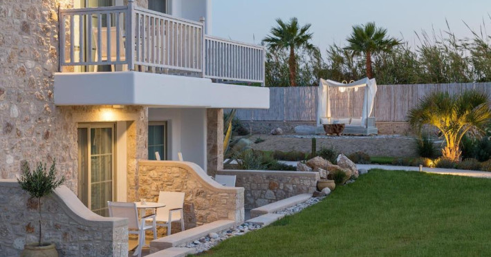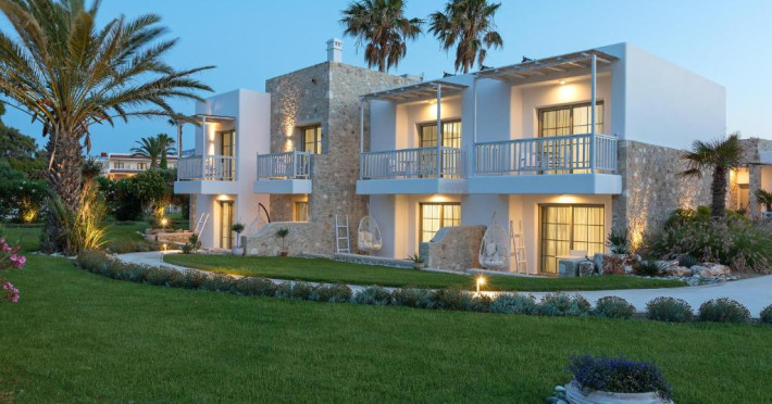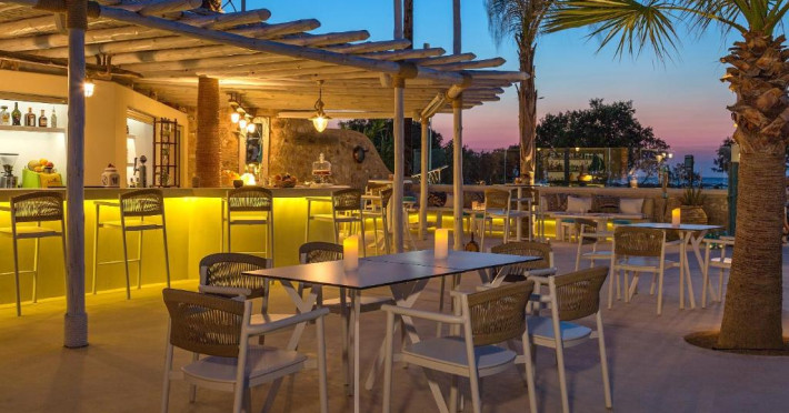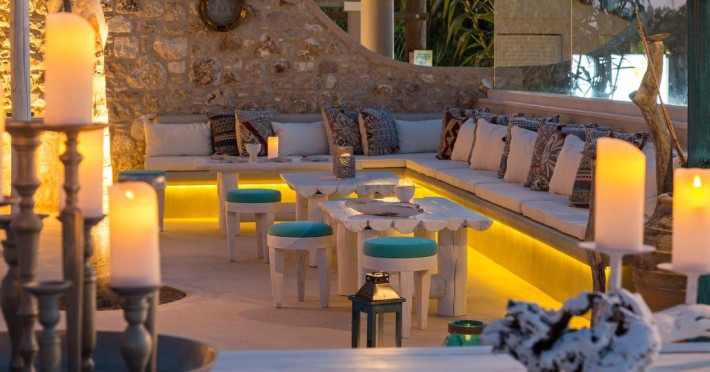 Restaurantul à la carte Aerides servește preparate tradiționale grecești. Oaspeții se pot bucura de cocktailuri la barul elegant in timp ce admiră apusul de soare de la Marea Egee.