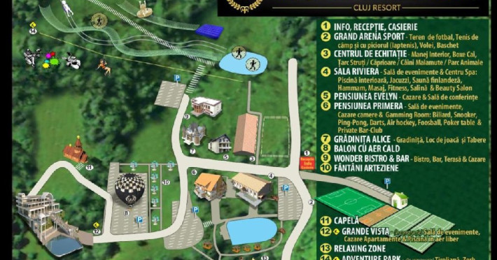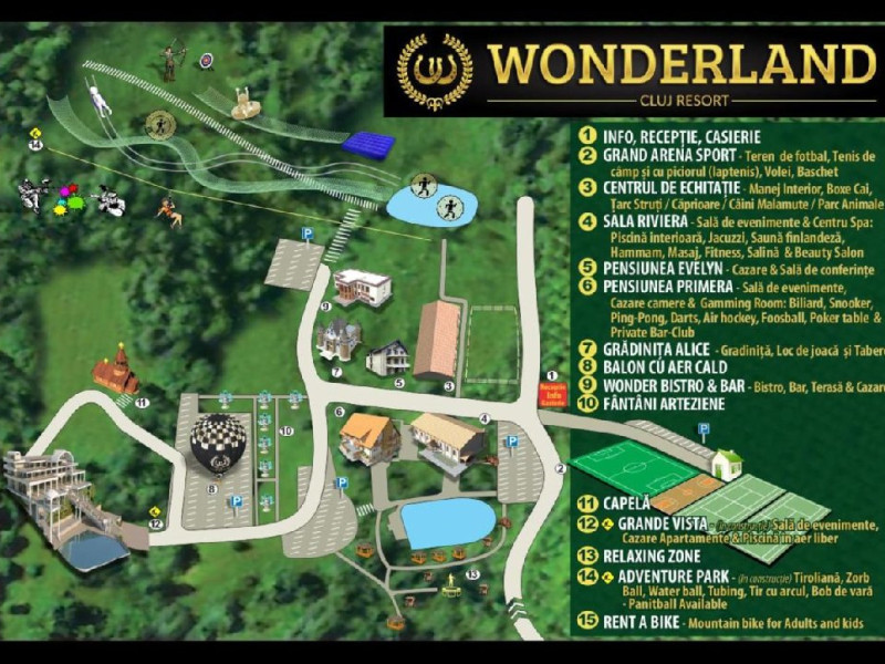 Wonderland Cluj Resort este situat la doar 7 km de oras vechi din Cluj-Napoca si pune la dispoziita oaspetilor o piscin, un centru spa, facilitti de echitatie si o teras cu vedere la lac. Este disponibil acces gratuit la internet WiFi. Camerele sunt decorate elegant in nuante calde deschise. Acestea includ TV cu ecran plat cu canale prin cablu si baie privat. Restaurantul a la carte serveste preparate din buctria local si interntional. Oaspeti se pot relaxa la bar si in grdina comun sau la centrul spa, Serviciile de masaj sunt disponibile la un cost suplimentar. De asemenea, oaspetii pot inchiria biciclete si pot explora dealurile din apropiere. Wonderland Cluj Resorts pune la dispozitie si facilitti de banchet. Proprietatea are receptie cu program nonstop. Orasul Turda se afl la 26,8 km de proprietate. Aeroportul International Avram Iancu Cluj este situat la 18,5 km. La complex este disponibil o parcare public gratuit.Datorita dinamicitatii domeniului disponibilitatea ofertelor se modifica de la un moment la altul. De aceea ofertele sunt valabile in limita locurilor disponibile. Agentia nu este responsabila pentru eventualele neconcordante care pot aparea intre informatiile privind tarifele si alte detalii din site si informatiile primite in agentie. In aceste cazuri vor avea prioritate, intotdeauna, informatiile primite in agentie.