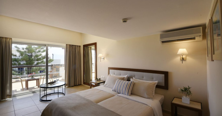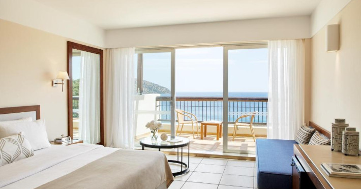 Sunt disponibile 311 camere. Fiecare cameră dispune de un aparat pentru preparare cafea sau ceai, cană-fierbător și minibar. Oaspeții pot solicita serviciul de room service pentru a servi masa sau diverse băuturi. În camere există baie cu cadă sau duș ce are în dotare foehn și articole de toaletă gratuite. Camerele confortabile de la Wyndham Grand Crete Mirabello Bay au pardoseală de gresie/ marmură, aer condiționat, Tv cu canale prin satelit și seif. Unele camere au balcon cu vedere la mare sau la grădină. Oaspeții au acces gratuit la serviciul Wi-fi în camere. Curățenia in cameră se face zilnic. Toate camerele spațioase de la Wyndham Grand Crete Mirabello Bay au zonă de relaxare cu canapea, ceea ce oferă un plus de confort. Proprietatea oferă camere pentru familie cu o suprafață mai mare și un număr mai mare de paturi față de cele standard. Se pot rezerva de asemenea camere pentru nefumători.