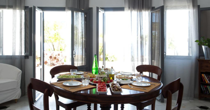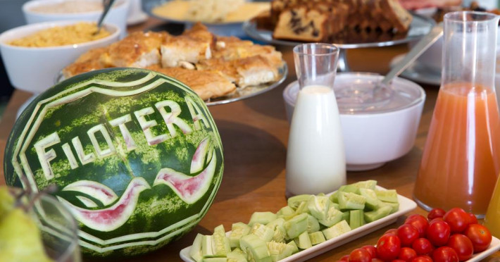 La Xenones Filoterra oaspeții au la dispoziție un restaurant care servește mâncare à la carte. Preparate din bucătăria grecească așteaptă să fie degustate în fiecare zi. Masa poate fi servită atât în interior, cît si în aer liber, pe terasă, în funcție de vreme. Oaspeţii pot avea diverse băuturi răcoritoare sau alcoolice la bar.