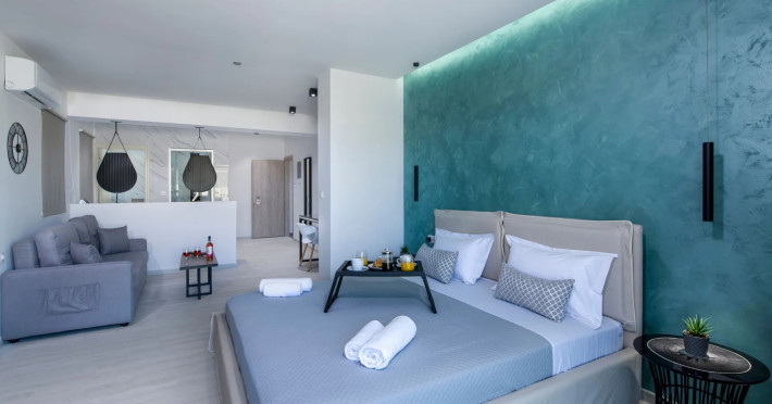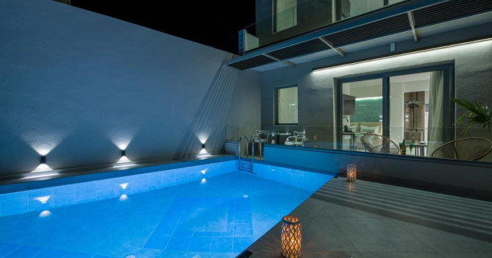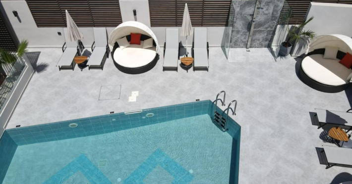 Every suite is completely autonomous, they accommodate up to two adults and measure 45-50sqm. Besides the modern design, the ample space of each suite, the natural light flooding in the rooms and the luxury amenities, what makes us stand out from a sea of accommodation choices, is our passion for technology and the ecosystem of a smart home. Every suite is equipped with the edge of technology and provide full control of the room by our guests, via the use of a tablet (that is also provided) or via voice control devices using the guest’s voice and thus making each stay even more comfortable. Pool, a Jacuzzi at each room and the meticulously designed, roof garden are features that will make your stay care-free. The property has a pool area, with round relaxation beds, sun loungers, umbrellas, shower and pool towels, offering guests a place to relax while the nearest beach is just 30 meters from the hotel.