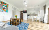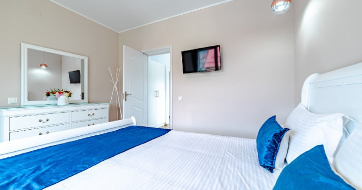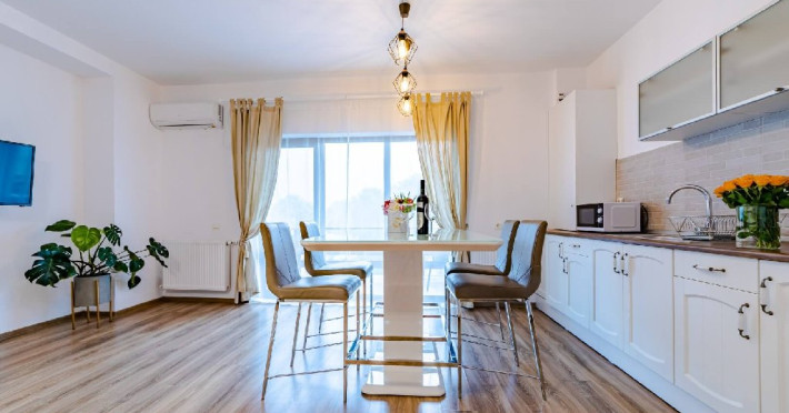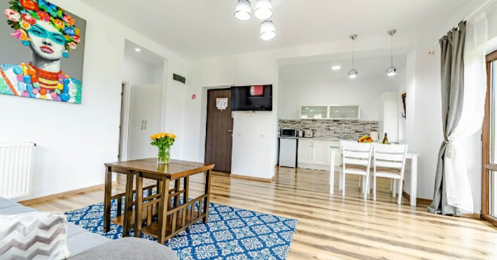 Apartamentele sunt formate din dormitor cu pat matrimonial, marime king size, living spatios dotat cu TV cu ecran plat si canapea extensibila pentru doua persoane, chicineta echipata cu frigider, cuptor cu microunde, cana fierbator si zona de servit masa.