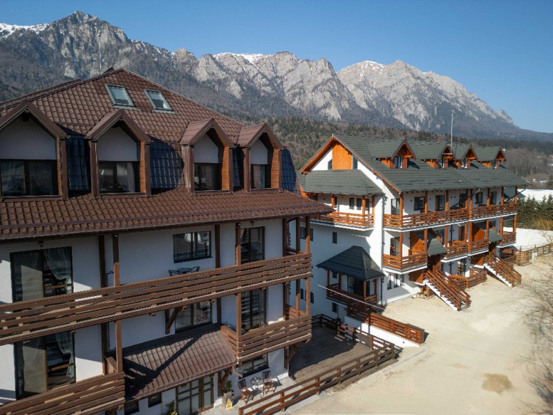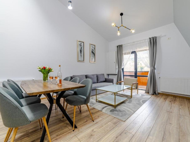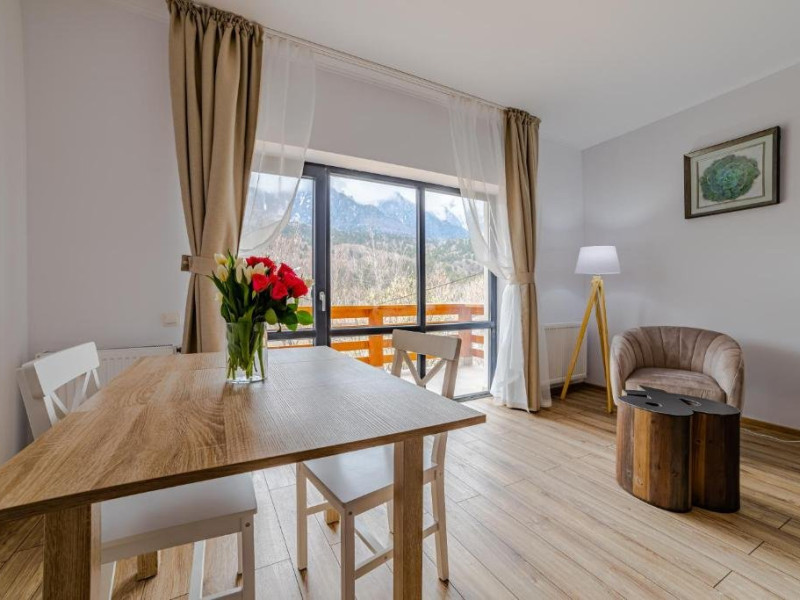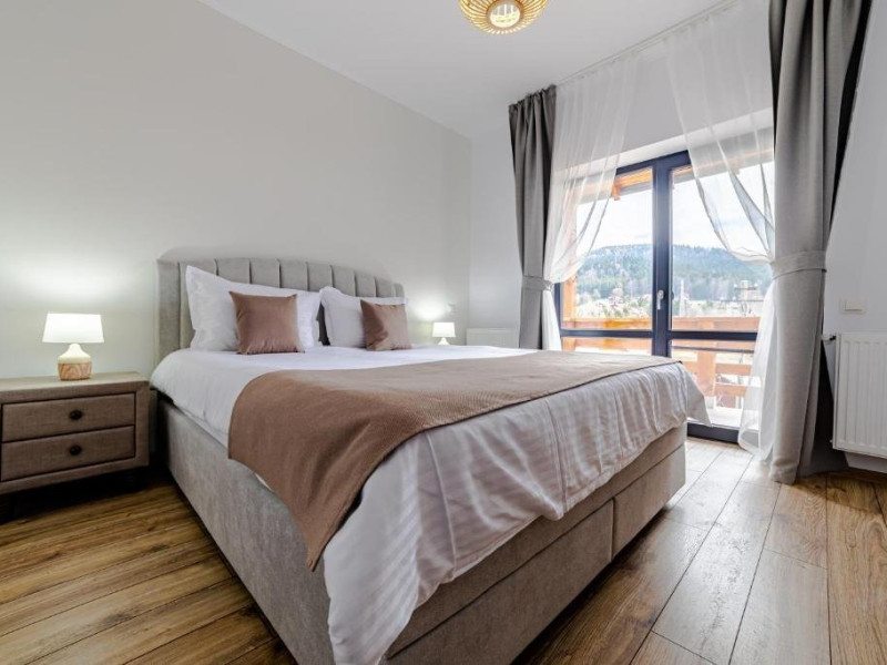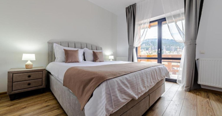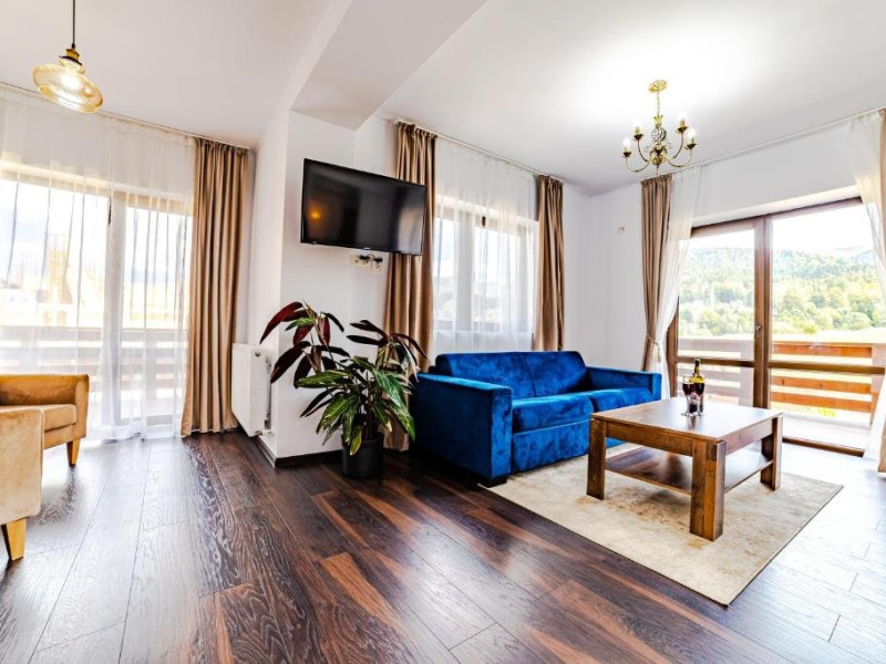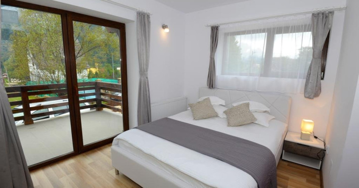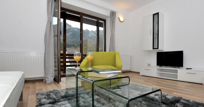 Apartamentele sunt formate din : dormitor cu pat matrimonial , living spatios cu TV cu ecran plat , canapea extensibila pentru 2 persoane , bucatarie moderna complet utilata (cuptor cu microunde,frigider , toster , cana fierbator , mobila moderna , baie cu toate dotarile necesare , balcoane generoase cu priveliste panoramica catre munte atat din dormitoare cat si din living.