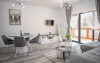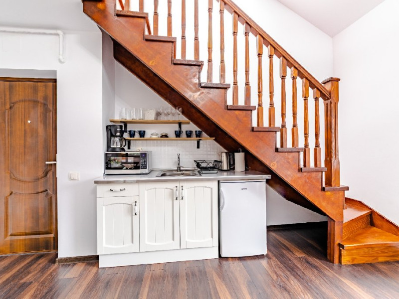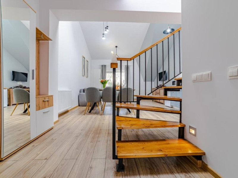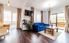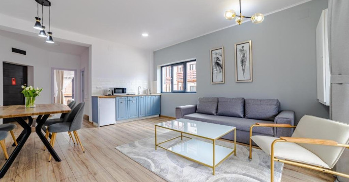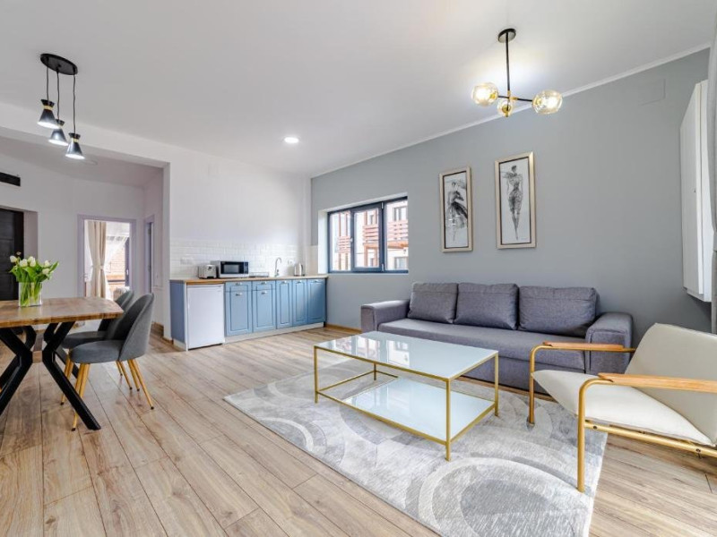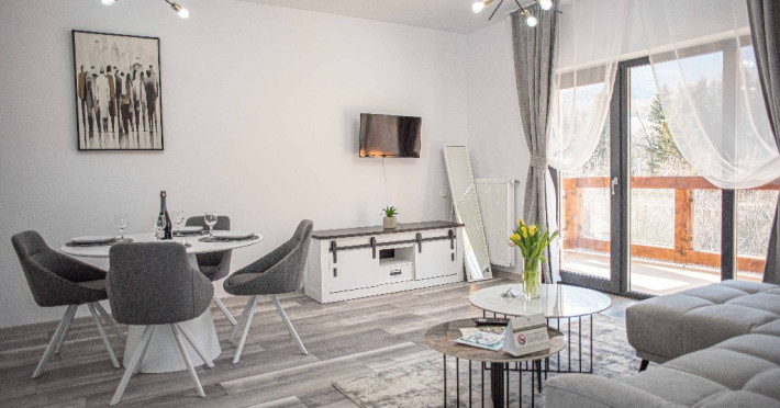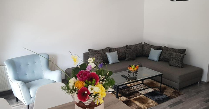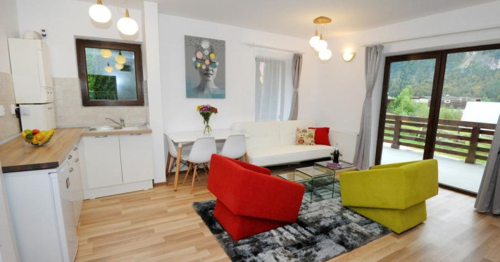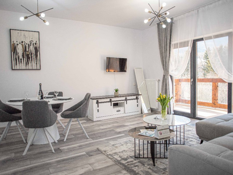 Apartamentele sunt formate din : dormitor cu pat matrimonial , living spatios cu TV cu ecran plat , canapea extensibila pentru 2 persoane , bucatarie moderna complet utilata (cuptor cu microunde,frigider , toster , cana fierbator , mobila moderna , baie cu toate dotarile necesare , balcoane generoase cu priveliste panoramica catre munte atat din dormitoare cat si din living.