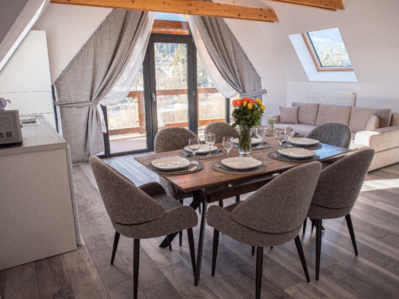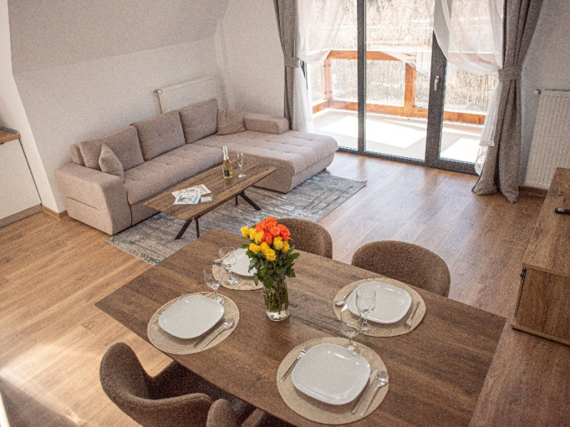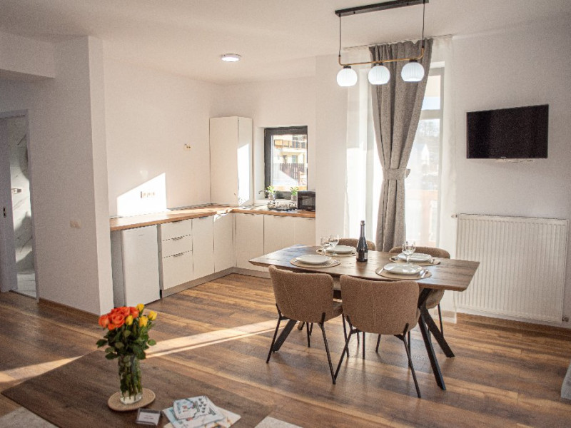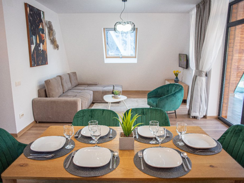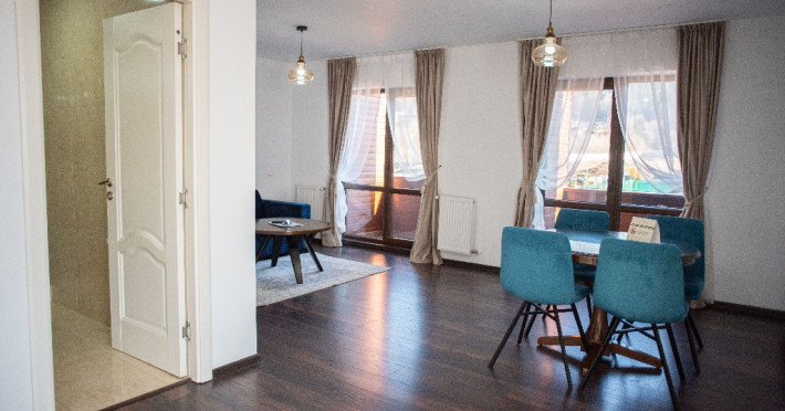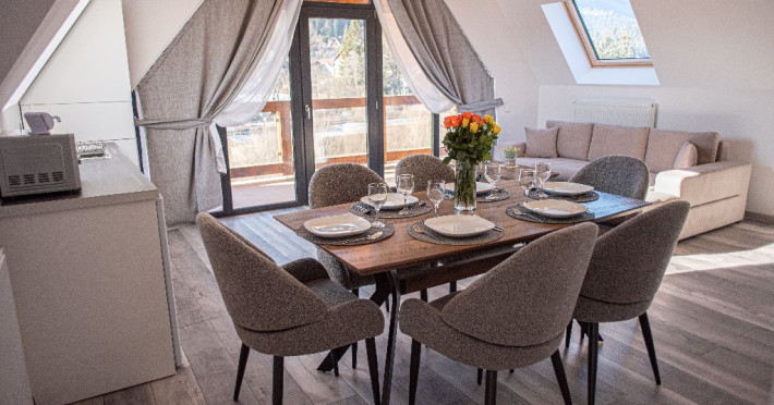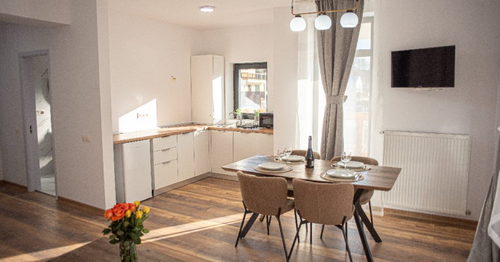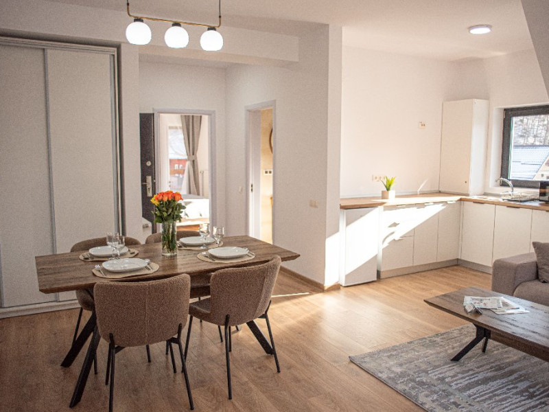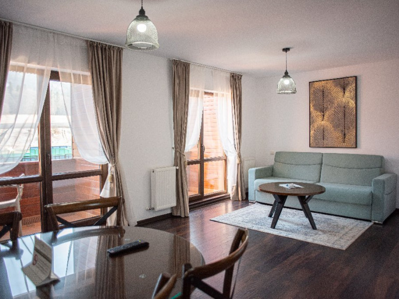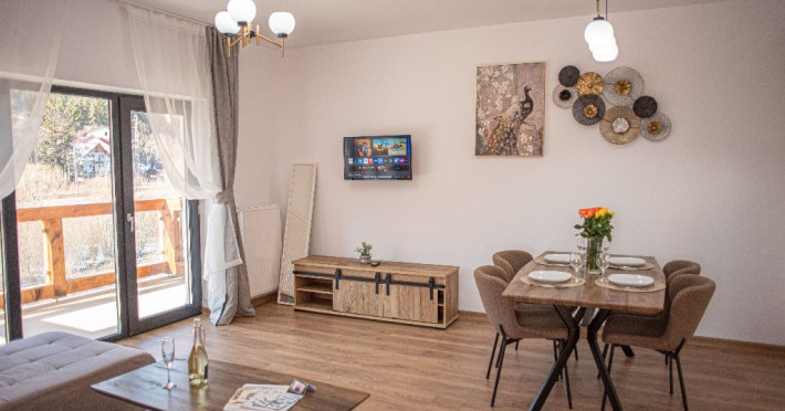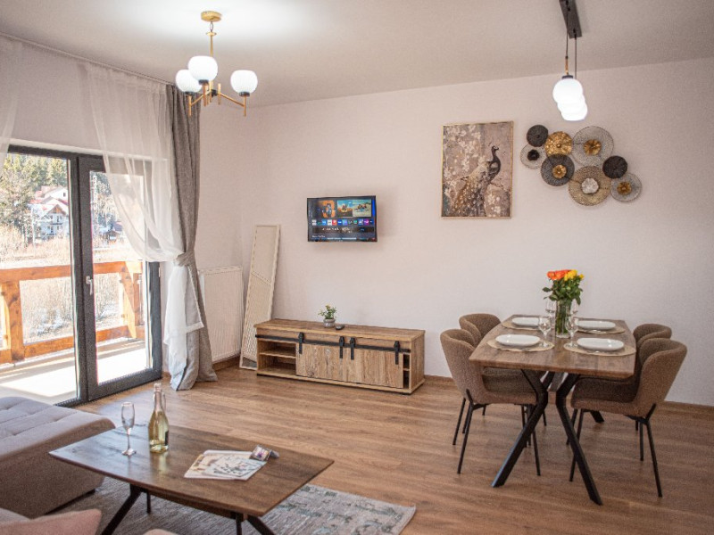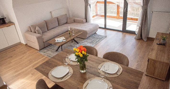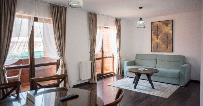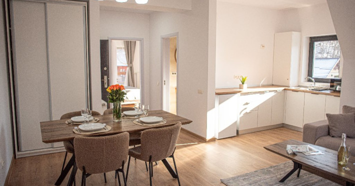 Toate apartamentele, suitele, studioul au chicineta dotate modern (cuptor cu microunde, vesela, cana electrica, frigider, prajitor paine etc.) Balcoanele generoase ofera zona de relaxare cu priveliste panoramica spre munte atat din dormitor cat si din living.