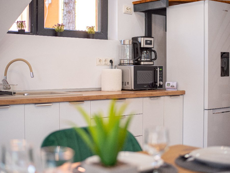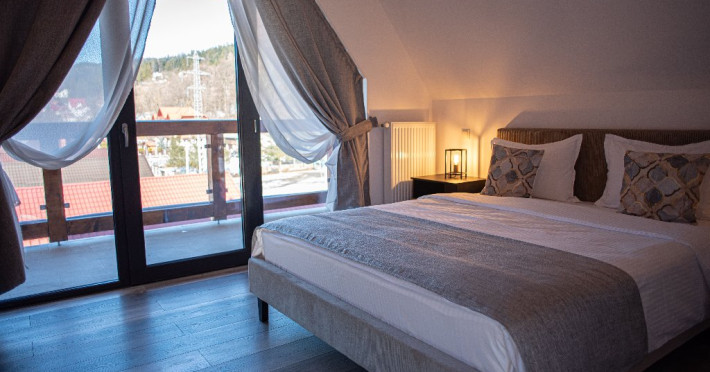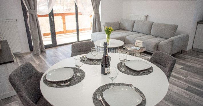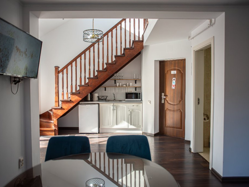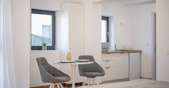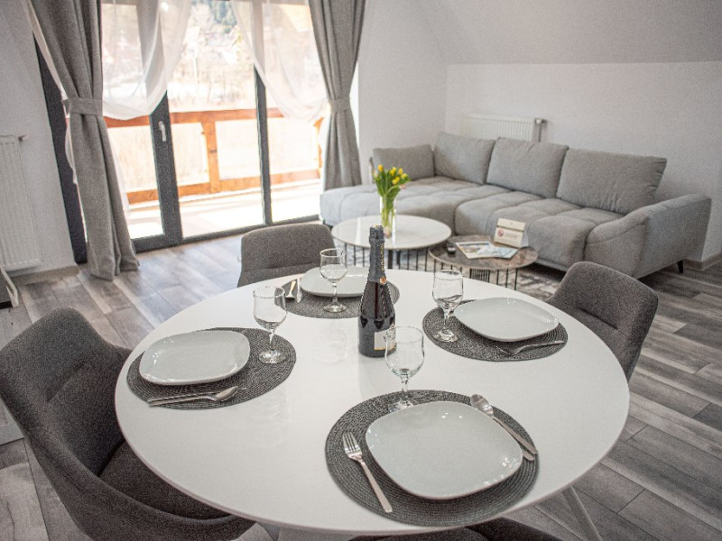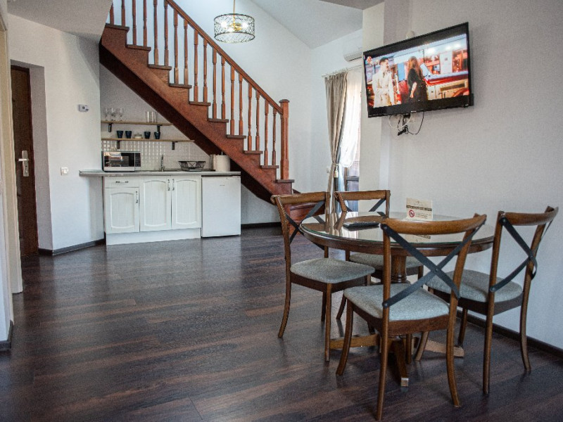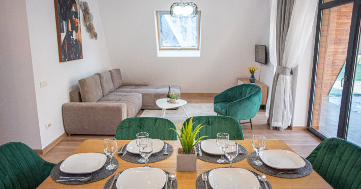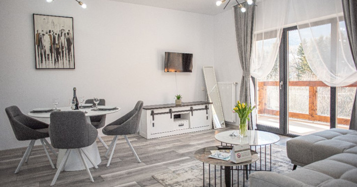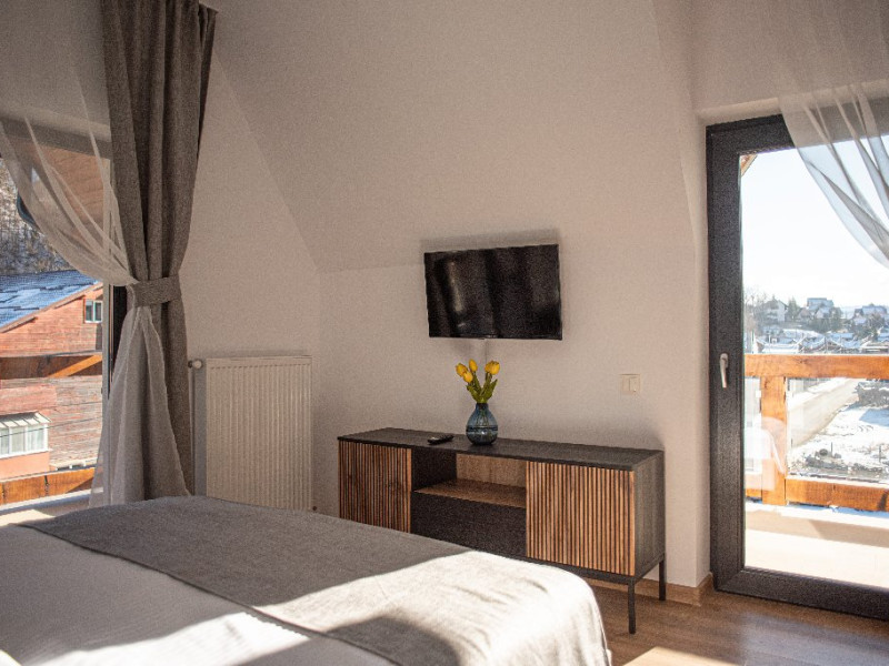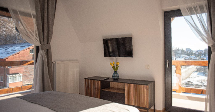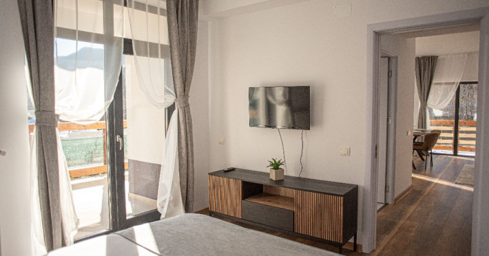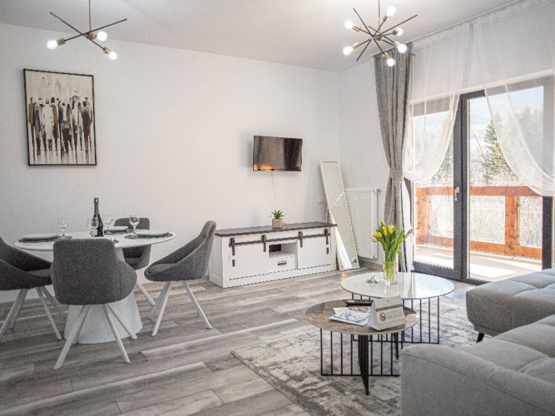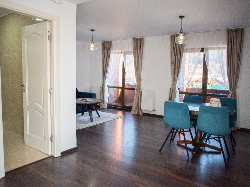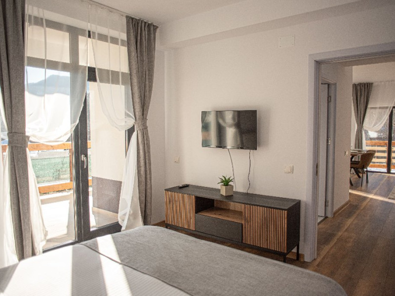 Toate apartamentele, suitele, studioul au chicineta dotate modern (cuptor cu microunde, vesela, cana electrica, frigider, prajitor paine etc.) Balcoanele generoase ofera zona de relaxare cu priveliste panoramica spre munte atat din dormitor cat si din living.