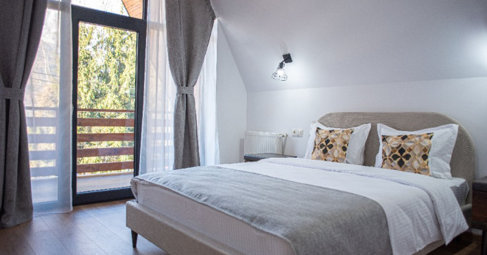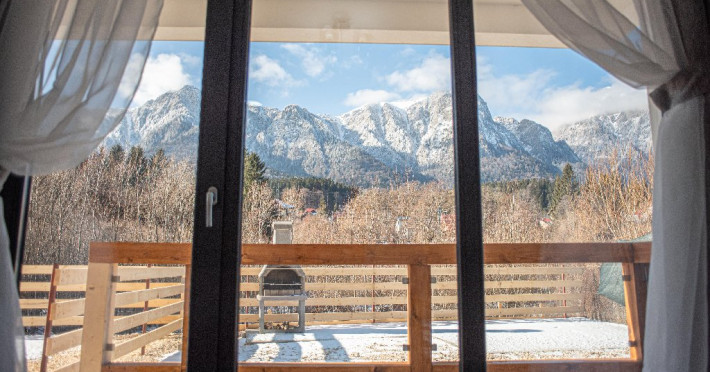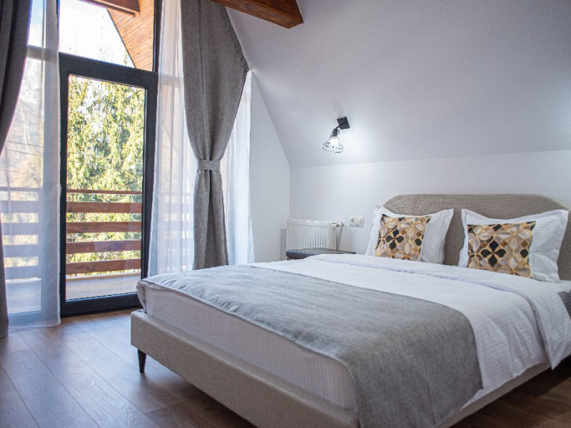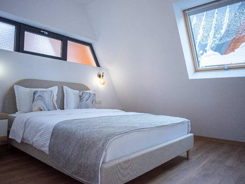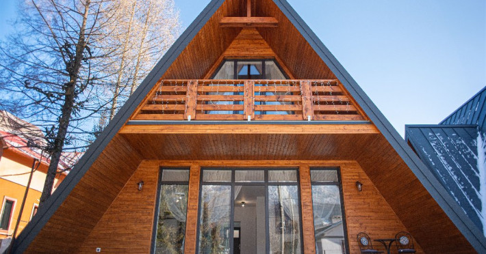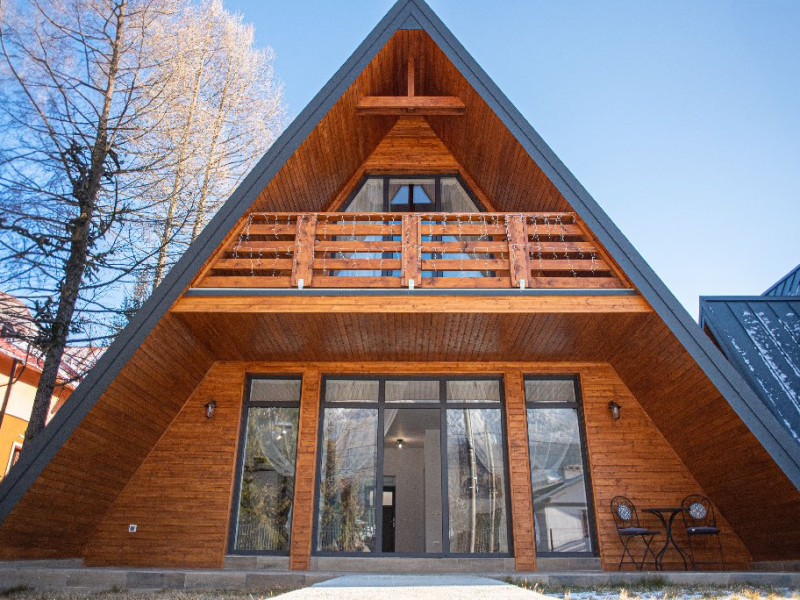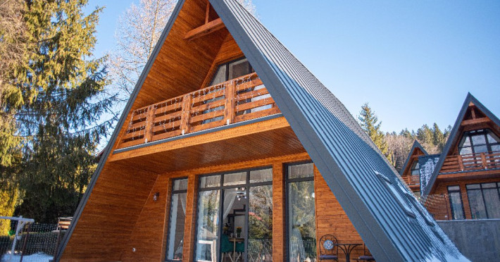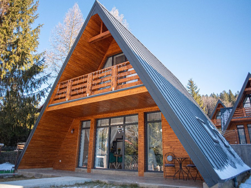 Casutele de tip A Frame includ doua dormitoare cu pat matrimonial, living cu chicineta si canapea, doua bai. LOCALIZARE