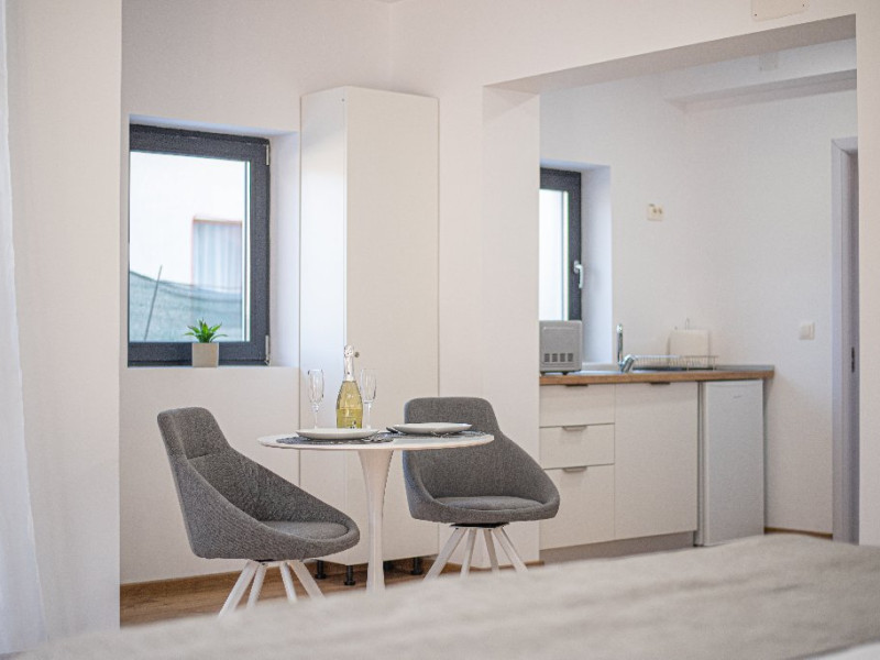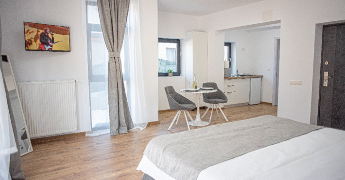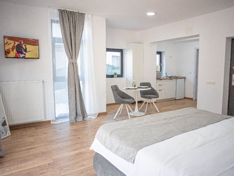 Studiourile sunt formate dintr-o camera cu pat matrimonial si o canapea extensibila pentru 3 adulti sau 2 adulti si 2 copii cu varsta pana la 5 ani.