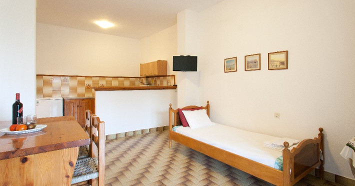 Studio standard double room (4 camere tip studio standard) si superior double room (4 camere tip superior double) si acestea sunt compuse din camere duble cu doua paturi separate, televizor, aer conditionat, frigider, balcon, baie cu dus.