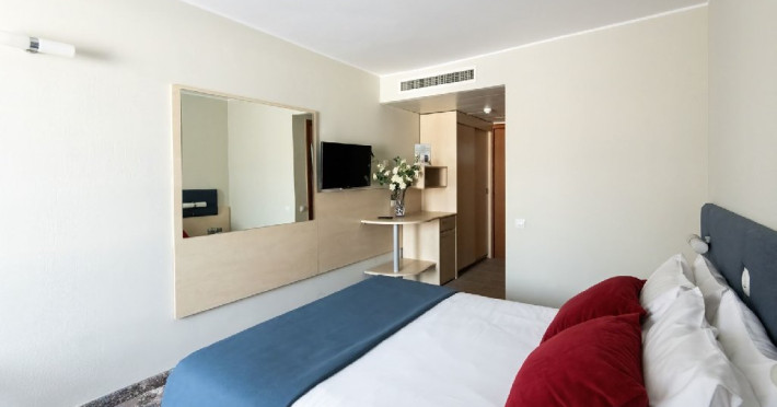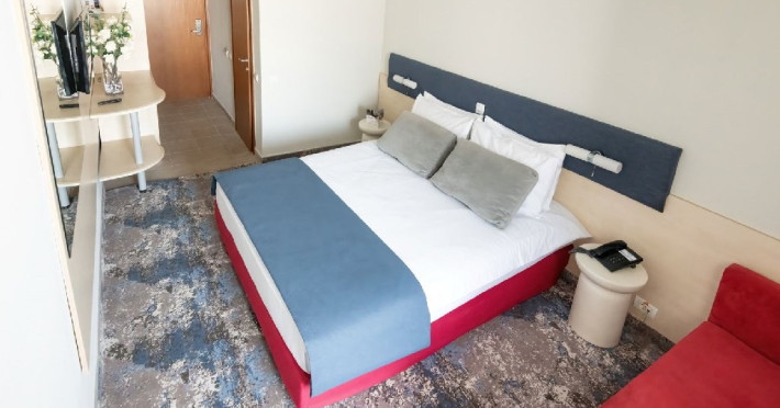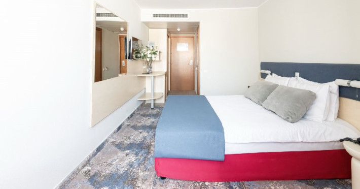 Camerele duble Jupiter/Junona - au suprafata totala de 21 mp (incluzand balcon si baie), au vedere spre statiune/parcare. Finisajele camerelor au fost refacute in 2025-2026 (mobilier, mocheta, draperii, renovare baie). Sunt dotate cu: balcon cu 2 scaune, pat matrimonial sau 2 paturi twin, bai cu cabina de dus si uscator de par, mocheta, mocheta pe hol si in baie, televizor, internet wireless, seif, 2 fotolii, masuta, minibar, aer conditionat, telefon, acces pe baza de card magnetic.