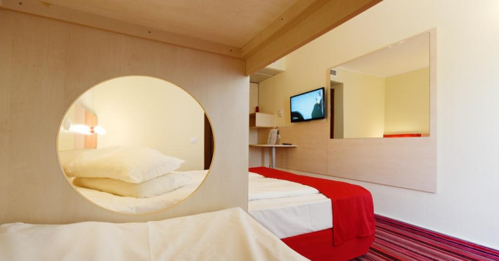 Camerele duble standard cu doua paturi suprapuse pentru copii dispun de pat matrimonial si 2 paturi supraetajate pe structura de lemn, pentru copii cu varsta pana la 13 ani, balcon 1mp, TV LED prin cablu, telefon, acces internet wireless, seif, 2 fotolii, masuta, baie cu cabina de dus, uscator de par.