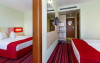- In camerele duble superior fara/cu vedere la mare cu o canapea neextensibila pentru 1 copil, corp JUNONA si in camerele duble standard, fara vedere la mare, cu o canapea neextensibila pentru 1 copil, corp JUPITER se accepta maxim 2 adulti si 1 copil cu varsta pana la 7 ani (inclusiv), micul dejun pentru copii fiind inclus in tarif.