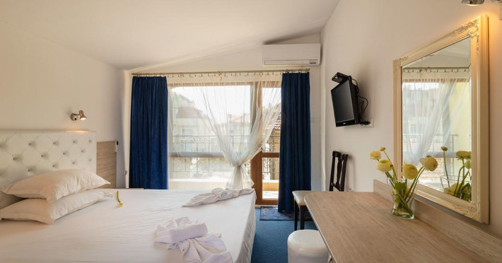 În camere există baie cu duș. Camerele luminoase de la Zeus Hotel Pomorie sunt dotate cu aer condiționat, Tv și seif. Oaspeții au acces gratuit la serviciul Wi-fi în camere. Curățenia in cameră se face zilnic. Proprietatea oferă camere pentru familie cu o suprafață mai mare și un număr mai mare de paturi față de cele standard. Se pot rezerva de asemenea camere pentru nefumători.