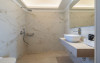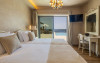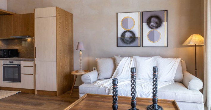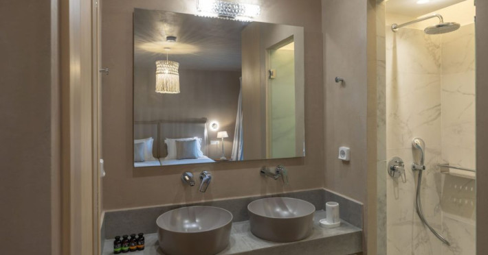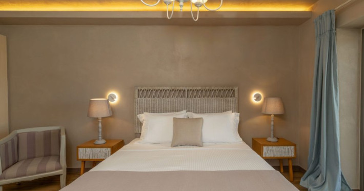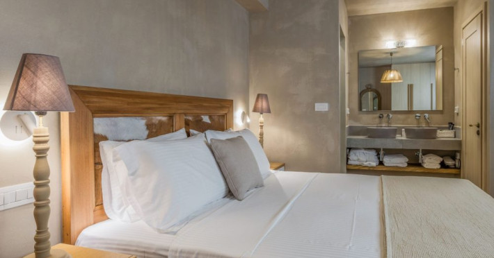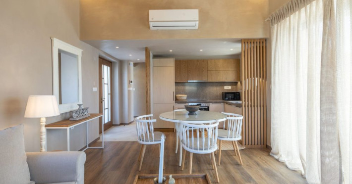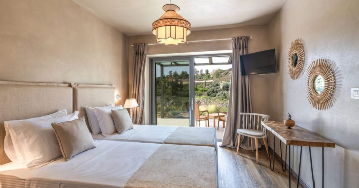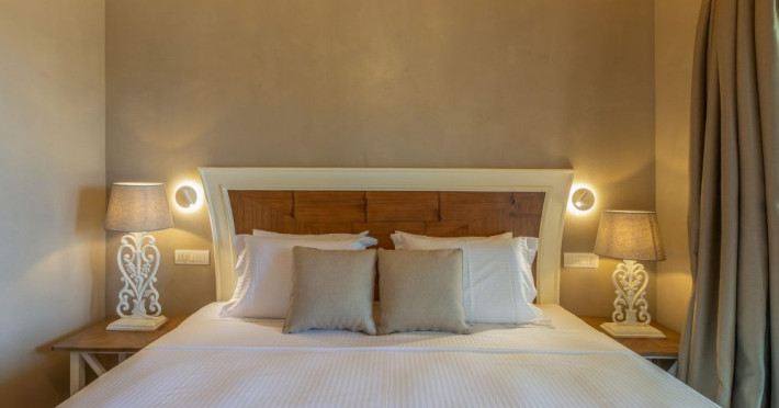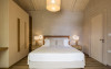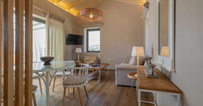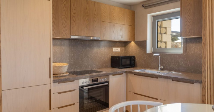 Inside, the villas are designed in a minimalistic style with boho accents and wooden decorations. Large balcony doors allow natural light to fill the space, creating a bright and airy atmosphere. Spacious bedrooms, each with en suite marble bathrooms, boast comfortable beds and earth-toned aesthetics. Each villa includes an open-plan, fully equipped kitchen with a dining area, along with a comfortably elegant living room. All living areas provide access to the outdoor spaces and private pool.