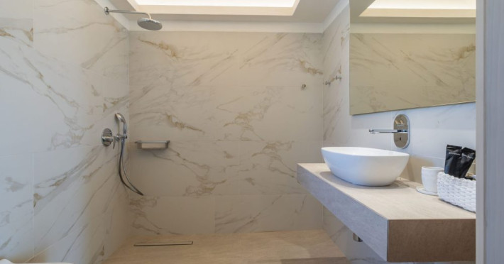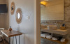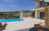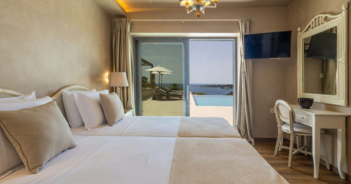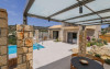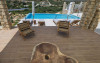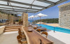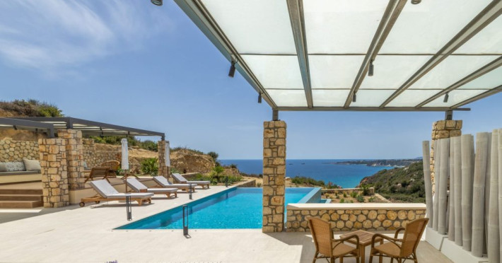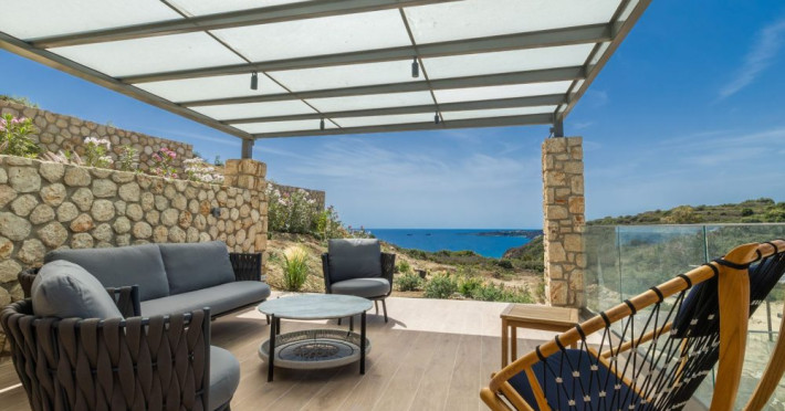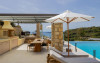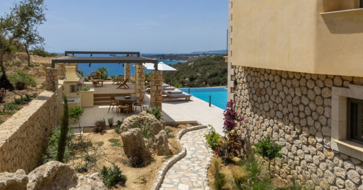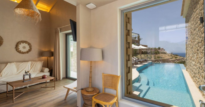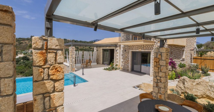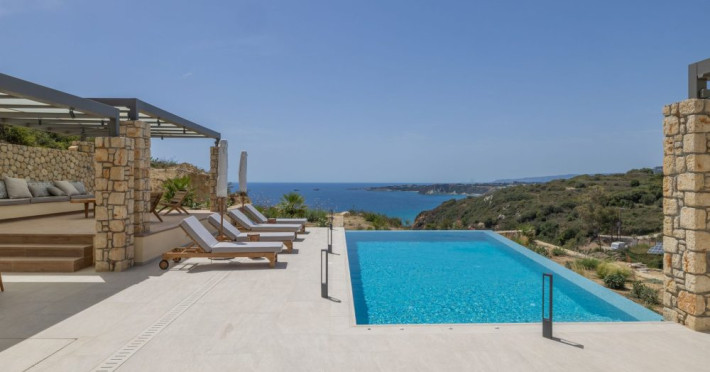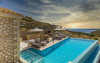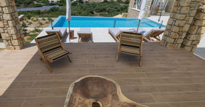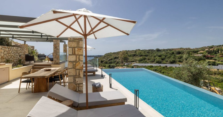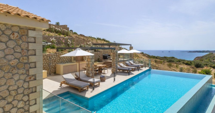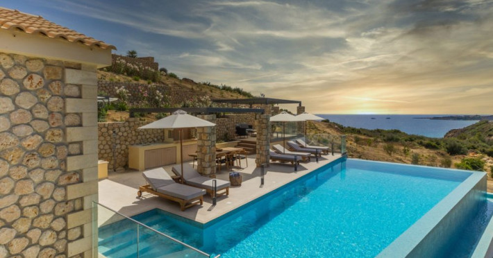 The expansive outdoor areas of Zeus Luxury Villas blend traditional stone elements with modern touches for a visually pleasing experience. Each villa features a private pool surrounded by a deck with sunbeds, a patio with dining and sitting areas, and a BBQ for delightful family meals.