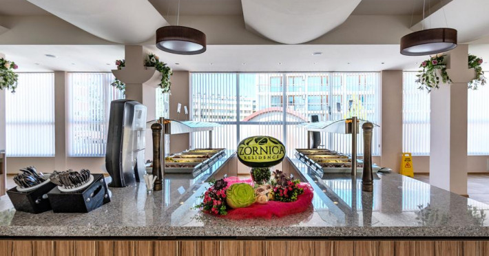 La Zornica Residence oaspeții au la dispoziție 2 restaurante unde pot savura mâncăruri delicioase, în stil bufet sau à la carte. Bucătăria mediteraneană de la Zornica Residence propune preparate delicioase care satisfac gusturi diverse. Masa poate fi servită atât în interior, cît si în aer liber, pe terasă, în funcție de vreme. Oaspeţii pot avea diverse băuturi răcoritoare sau alcoolice la bar. În cadrul proprietății există și un snack bar care servește băuturi și gustări.