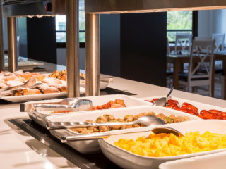 Există o sală de mese cu un bufet cuprinzător și un servic...