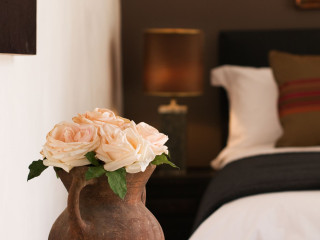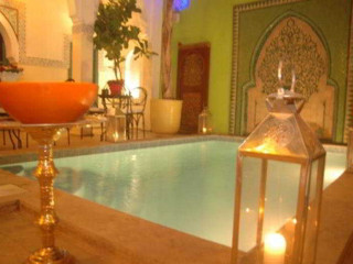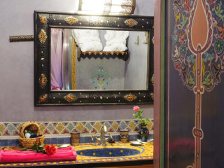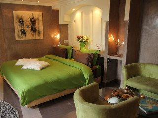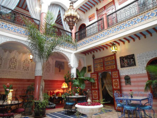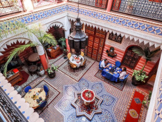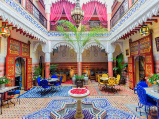 The establishment embodies the oriental charm of its authentic palace with carved wood, frescoes made of zellige mosaic and old columns. Since time keeps doing its work, todays materials and colours a...