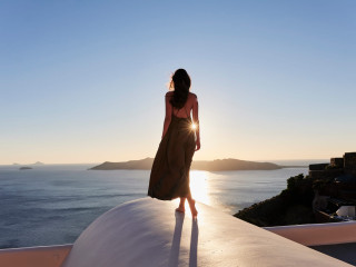 At the narrowest point of Santorini Island, her delicate neck comes into sight as one drives the winding road that leads to Oia, high above sea level. A discreet entrance to a passa...