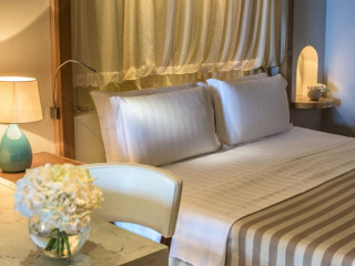 From its position on the hill, the hotel dominates the huge golden beach lapped by the crystal clear sea. It is a masterpiece of cool simplicity, with its bungalows scattered over the headland overloo...