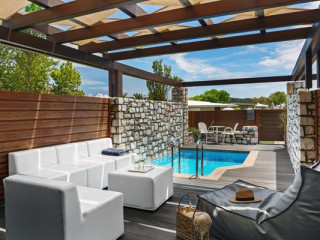 Se afla la doar 2 km de orasul Skiathos, fiind pozitionat intr-o zona linistita langa plantatiile luxuriante de maslini si pini, cu vedere spre oras, munte, cetatea istorica Bourtzi dar si asupra Mari...