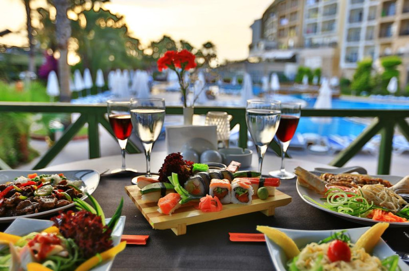 La Lyra Resort oaspeții au la dispoziție 6 restaurante unde pot savura mâncăruri delicioase, în stil bufet sau à la carte. Preparate din bucătăria internațională, italiană, precum și preparate pescărești așteaptă să fie degustate în fiecare zi la micul dejun, prânz și cină. Masa poate fi servită atât în interior, cît si în aer liber, pe terasă, în funcție de vreme. 7 baruri, dintre care unul la piscină și unul pe plajă, sunt disponibile cu o ofertă variată de băuturi răcoritoare și alcoolice. În cadrul proprietății există și o cafenea ideală pentru o gustare rapidă. Lyra Resort pune la dispoziție meniuri pentru diete speciale și o zonă de picnic.