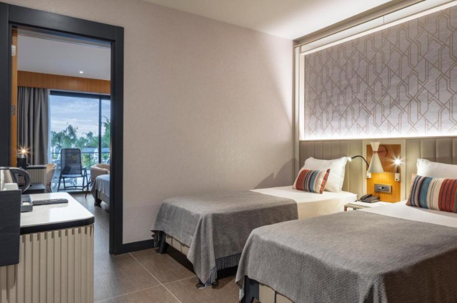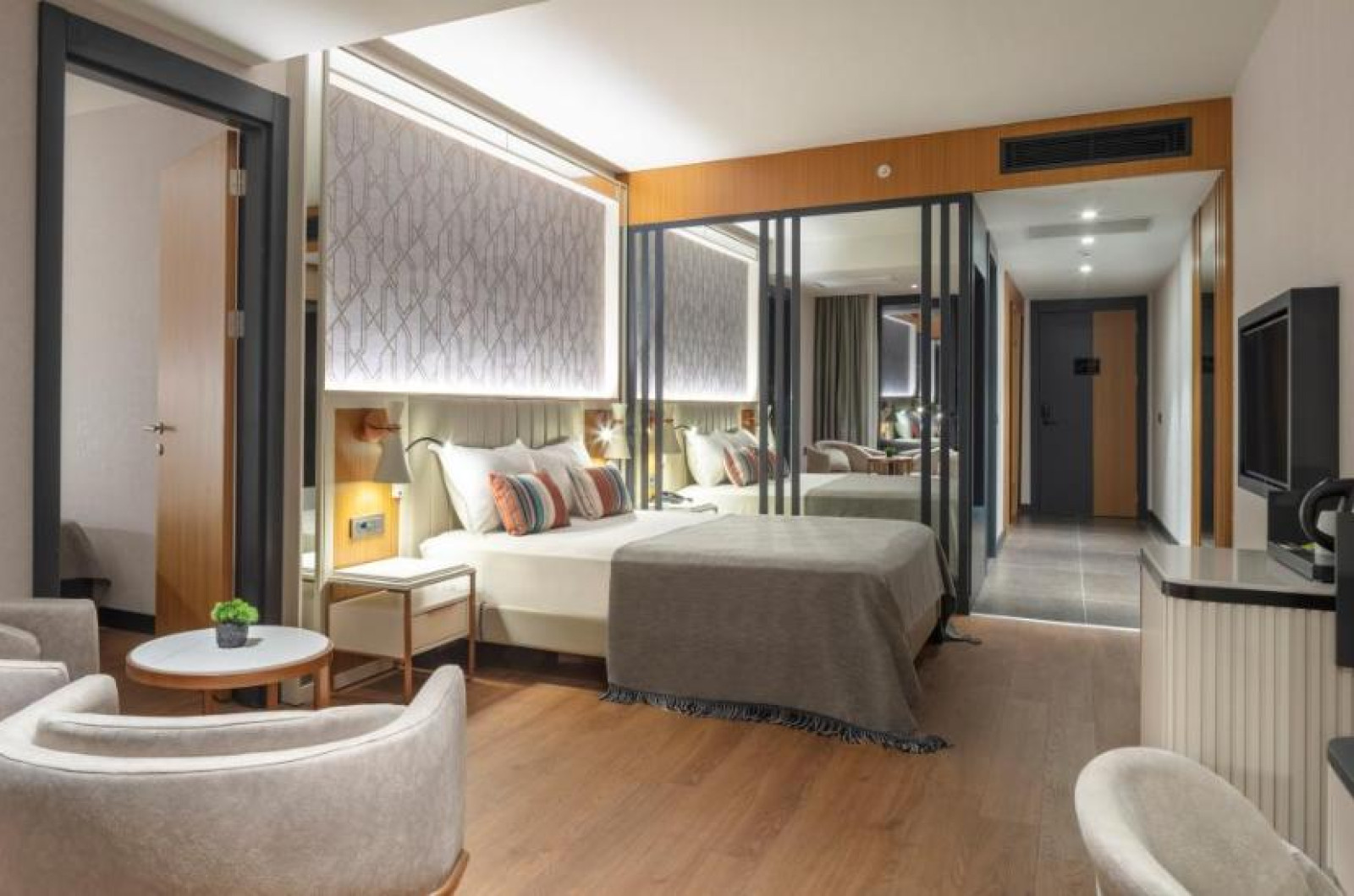 Unele camere au balcon cu vedere la mare, unde oaspeții pot admira apusul sau răsăritul soarelui. În camere există baie cu cadă sau duș, foehn, articole de toaletă gratuite, precum și halate de baie și papuci. Fiecare cameră dispune de minibar. Oaspeții pot solicita serviciul de room service pentru a servi masa sau diverse băuturi. Camerele luminoase de la Mylome Luxury Hotel & Resort sunt dotate cu aer condiționat și Tv cu canale prin satelit. Oaspeții au acces gratuit la serviciul Wi-fi în camere. Curățenia in cameră se face zilnic. Proprietatea oferă camere pentru familie cu o suprafață mai mare și un număr mai mare de paturi față de cele standard.
