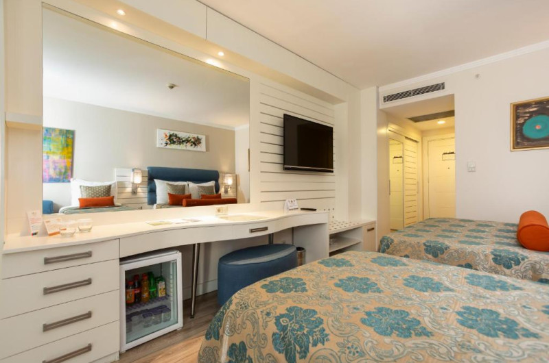 Fiecare cameră dispune de un aparat pentru preparare cafea sau ceai, cană-fierbător și minibar. Oaspeții pot solicita serviciul de room service pentru a servi masa sau diverse băuturi. În camere există baie cu cadă sau duș ce are în dotare foehn și articole de toaletă gratuite. Unele camere au balcon cu vedere la mare sau la piscină. Oaspeții au acces gratuit la serviciul Wi-fi în camere. Curățenia in cameră se face zilnic. Toate camerele spațioase de la Orange County Resort Hotel Kemer au zonă de relaxare cu canapea, ceea ce oferă un plus de confort. Proprietatea oferă camere pentru familie cu o suprafață mai mare și un număr mai mare de paturi față de cele standard. Se pot rezerva de asemenea camere pentru nefumători.
