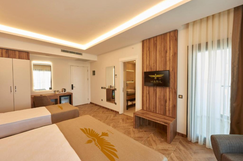 Camerele luminoase de la Maril Resort sunt dotate cu aer condiționat și Tv cu canale prin satelit. Oaspeții au la dispoziție serviciul de room service pentru a servi masa sau diverse băuturi. Unele camere au vedere la mare. În camere există baie cu cadă sau duș, foehn, articole de toaletă gratuite, precum și halate de baie și papuci. Oaspeții au acces gratuit la serviciul Wi-fi în camere. Curățenia in cameră se face zilnic. Proprietatea oferă camere pentru familie cu o suprafață mai mare și un număr mai mare de paturi față de cele standard.