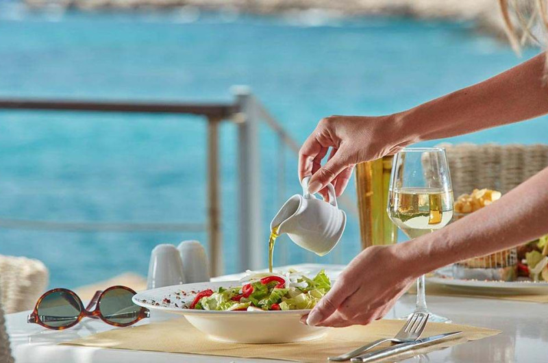 La Atlantica Grand Mediterraneo Resort & Spa oaspeții au la dispoziție 3 restaurante unde pot savura mâncăruri delicioase, în stil bufet sau à la carte. Preparate din bucătăria mediteraneeană și italiană sunt preparate zilnic. Masa poate fi servită atât în interior, cît si în aer liber, pe terasă, în funcție de vreme. 2 baruri, dintre care unul la piscină, sunt disponibile cu o ofertă variată de băuturi răcoritoare și alcoolice.