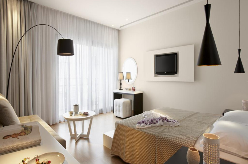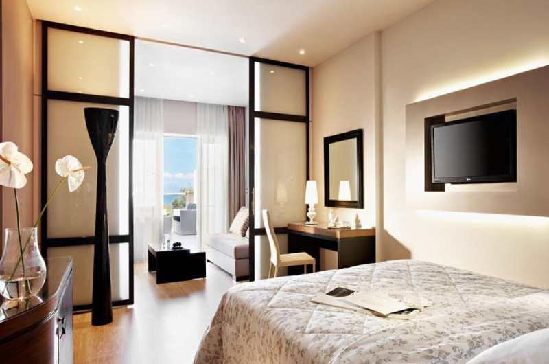 Sunt disponibile 388 camere. Unele camere au balcon cu vedere la mare sau la grădină. Fiecare cameră dispune de minibar și cană-fierbător. Oaspeții pot solicita serviciul de room service pentru a servi masa sau diverse băuturi. În camere există baie cu cadă sau duș, foehn, articole de toaletă gratuite, precum și halate de baie și papuci. Camerele luminoase de la Marbella Corfu sunt dotate cu parchet, aer condiționat, Tv cu canale prin satelit și seif. Oaspeții au acces gratuit la serviciul Wi-fi în camere. Curățenia in cameră se face zilnic. Anumite camere au zonă de relaxare și cadă cu hidromasaj care asigură un plus de confort și răsfăț. Proprietatea oferă camere pentru familie cu o suprafață mai mare și un număr mai mare de paturi față de cele standard.