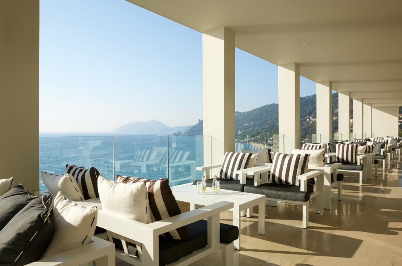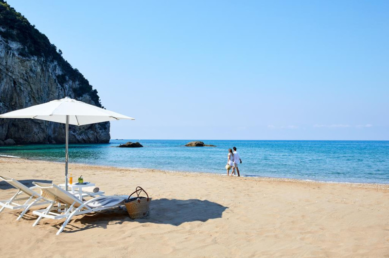 Mayor La Grotta Verde Grand Resort are în apropiere o plajă cu nisip. Pe plajă există șezlonguri și umbrele de plajă.