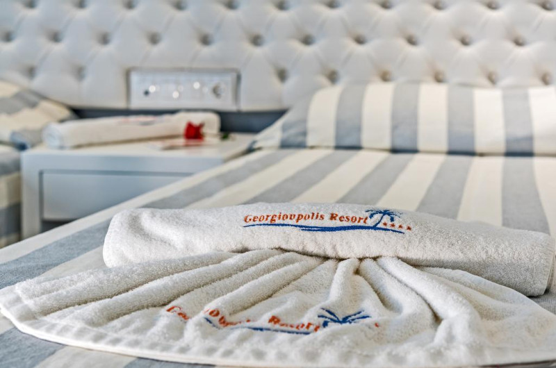 Sunt disponibile 155 camere. Camerele confortabile de la Georgioupolis Resort Aquapark & Spa au pardoseală de gresie/ marmură, aer condiționat și Tv cu canale prin satelit. În camere există baie cu cadă sau duș ce are în dotare foehn și articole de toaletă gratuite. Fiecare cameră dispune de minibar și cană-fierbător. Oaspeții pot solicita serviciul de room service pentru a servi masa sau diverse băuturi. Unele camere au balcon cu vedere la grădină sau la piscină. Oaspeții au acces gratuit la serviciul Wi-fi în camere. Curățenia in cameră se face zilnic. Proprietatea oferă camere pentru familie cu o suprafață mai mare și un număr mai mare de paturi față de cele standard.