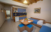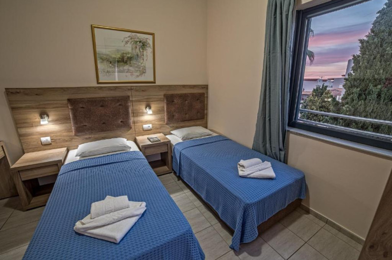 Sunt disponibile 58 camere. Unele camere au balcon, cu vedere la piscină, unde oaspeții se pot relaxa în voie. În camere există baie cu cadă sau duș ce are în dotare foehn și articole de toaletă gratuite. Camerele luminoase de la Blue Aegean Hotel And Suites sunt dotate cu aer condiționat, Tv și seif. Fiecare cameră dispune de mașină pentru preparare cafea sau ceai și fierbător Oaspeții au acces gratuit la serviciul Wi-fi în camere. Curățenia in cameră se face zilnic. Anumite camere au cadă cu hidromasaj care asigură un plus de confort și răsfăț. Fiecare unitate de cazare include o chicinetă utilată cu frigider, plită de gătit și ustensile de bucătărie. De asemenea, sunt disponibile o zonă de luat masa și un cuptor cu microunde. Proprietatea oferă camere pentru familie cu o suprafață mai mare și un număr mai mare de paturi față de cele standard.