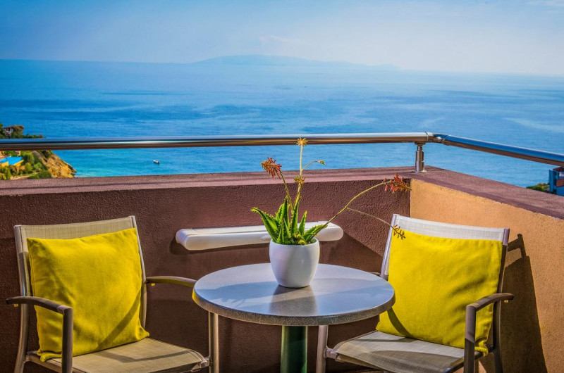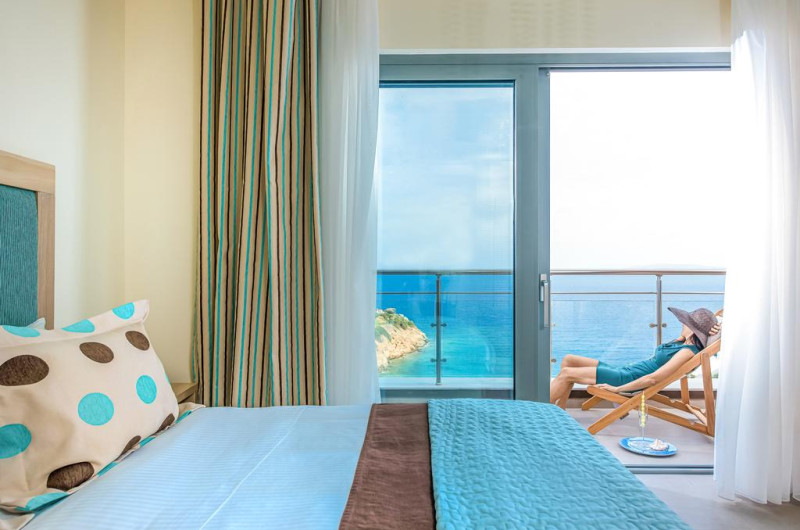 Sunt disponibile 209 camere. Camerele confortabile de la Blue Bay au pardoseală de gresie/ marmură, aer condiționat, Tv cu canale prin satelit și seif. Oaspeții au la dispoziție serviciul de room service pentru a servi masa sau diverse băuturi. În camere există baie cu cadă sau duș ce are în dotare foehn și articole de toaletă gratuite. Unele camere au balcon cu vedere la mare sau la piscină. Oaspeții au acces gratuit la serviciul Wi-fi în camere. Curățenia in cameră se face zilnic. Anumite camere au cadă cu hidromasaj care asigură un plus de confort și răsfăț. Fiecare unitate de cazare are frigider. Proprietatea oferă camere pentru familie cu o suprafață mai mare și un număr mai mare de paturi față de cele standard.