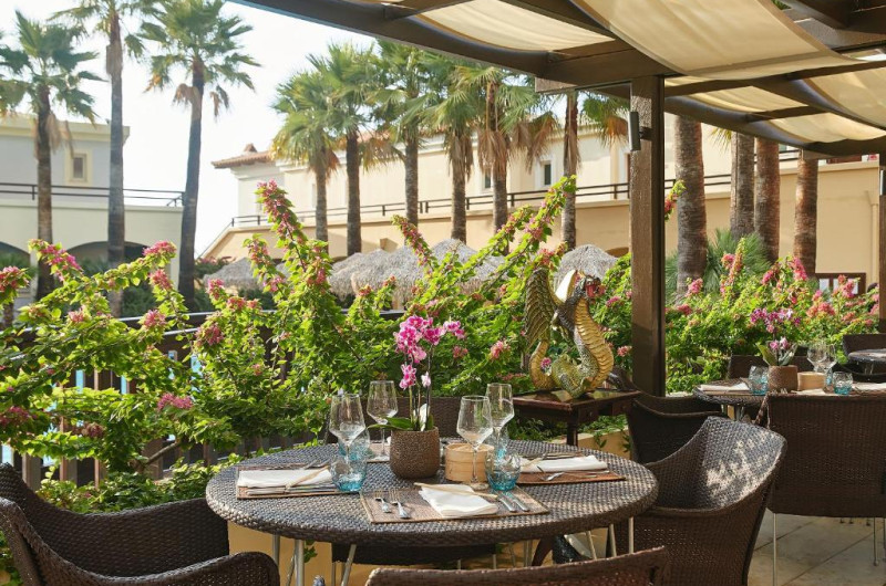 La Grecotel Marine Palace & Aqua Park oaspeții au la dispoziție 5 restaurante unde pot savura mâncăruri delicioase, în stil bufet sau à la carte. Preparate din bucătăria internațională, orientală, asiatică și italiană propun mâncăruri pentru gusturi diverse. Masa poate fi servită atât în interior, cît si în aer liber, pe terasă, în funcție de vreme. 6 baruri, dintre care unul la piscină, sunt disponibile cu o ofertă variată de băuturi răcoritoare și alcoolice.
