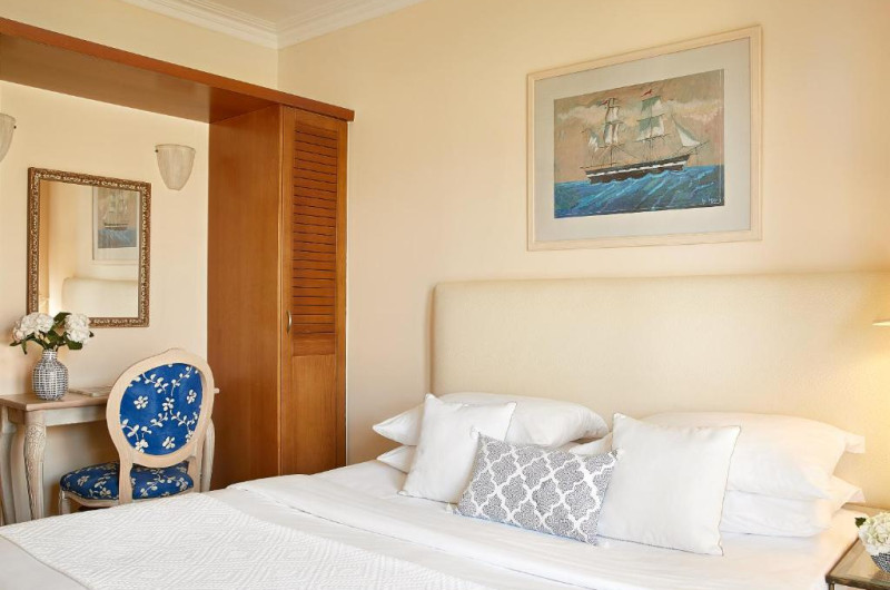 Sunt disponibile 426 camere. Camerele confortabile de la Grecotel Marine Palace & Aqua Park au pardoseală de gresie/ marmură, aer condiționat, Tv cu canale prin satelit și seif. Fiecare cameră dispune de minibar și cană-fierbător. Oaspeții pot solicita serviciul de room service pentru a servi masa sau diverse băuturi. Camerele au balcon cu vedere la mare sau la grădină. În camere există baie cu cadă sau duș ce are în dotare foehn și articole de toaletă gratuite. Oaspeții au acces gratuit la serviciul Wi-fi în camere. Curățenia in cameră se face zilnic. Anumite camere au cadă cu hidromasaj care asigură un plus de confort și răsfăț. Proprietatea oferă camere pentru familie cu o suprafață mai mare și un număr mai mare de paturi față de cele standard.
