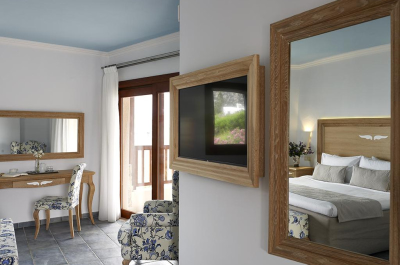 Sunt disponibile 249 camere. Fiecare cameră dispune de minibar și cană-fierbător. Oaspeții pot solicita serviciul de room service pentru a servi masa sau diverse băuturi. În camere există baie cu cadă sau duș, foehn, articole de toaletă gratuite, precum și halate de baie și papuci. Unele camere au balcon cu vedere la mare sau la grădină. Camerele confortabile de la Ikaros Beach Luxury Resort And Spa au pardoseală de gresie/ marmură, aer condiționat, Tv cu canale prin satelit și seif. Oaspeții au acces gratuit la serviciul Wi-fi în camere. Curățenia in cameră se face zilnic. Toate camerele spațioase de la Ikaros Beach Luxury Resort And Spa au zonă de relaxare. Proprietatea oferă camere pentru familie cu o suprafață mai mare și un număr mai mare de paturi față de cele standard. Se pot rezerva de asemenea camere pentru nefumători.